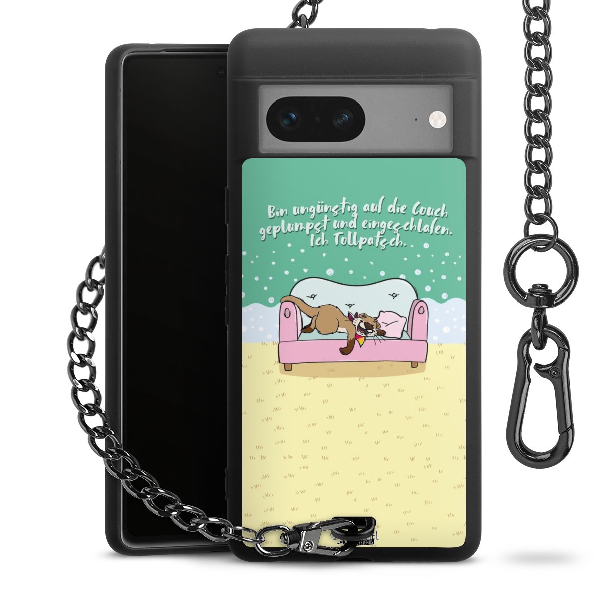 Die mattschwarze Silikon-Handyhülle besteht aus robustem TPU (thermoplastisches Polyurethan). Sie ist flexibel und schützt Dein Smartphone vor Stößen und Kratzern. Die Kette sowie der Karabinerhaken sind aus Metall in Gunmetal-Optik gefertigt. Für dieses Produkt kommen ausschließlich TÜV-geprüfte Materialien zum Einsatz.