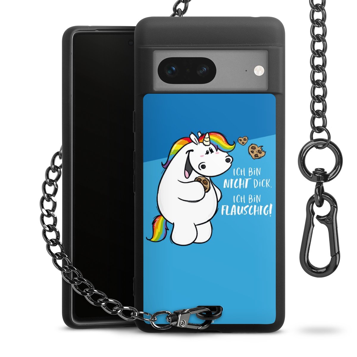 Die mattschwarze Silikon-Handyhülle besteht aus robustem TPU (thermoplastisches Polyurethan). Sie ist flexibel und schützt Dein Smartphone vor Stößen und Kratzern. Die Kette sowie der Karabinerhaken sind aus Metall in Gunmetal-Optik gefertigt. Für dieses Produkt kommen ausschließlich TÜV-geprüfte Materialien zum Einsatz.