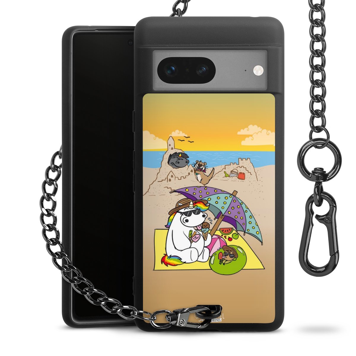 Die Handyhülle verfügt über eine mittig am unteren Rand platzierte Öse, an der die Metallkette stabil befestigt ist. Bestelle die Hülle einfach für Dein Smartphone-Modell, dann passt sie wie angegossen und Du brauchst sie bloß einmal anzudrücken. Handy in die Tasche, Karabiner an den Hosenbund – schon kann die Party starten.