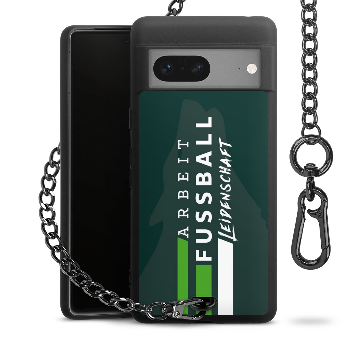 Die mattschwarze Silikon-Handyhülle besteht aus robustem TPU (thermoplastisches Polyurethan). Sie ist flexibel und schützt Dein Smartphone vor Stößen und Kratzern. Die Kette sowie der Karabinerhaken sind aus Metall in Gunmetal-Optik gefertigt. Für dieses Produkt kommen ausschließlich TÜV-geprüfte Materialien zum Einsatz.