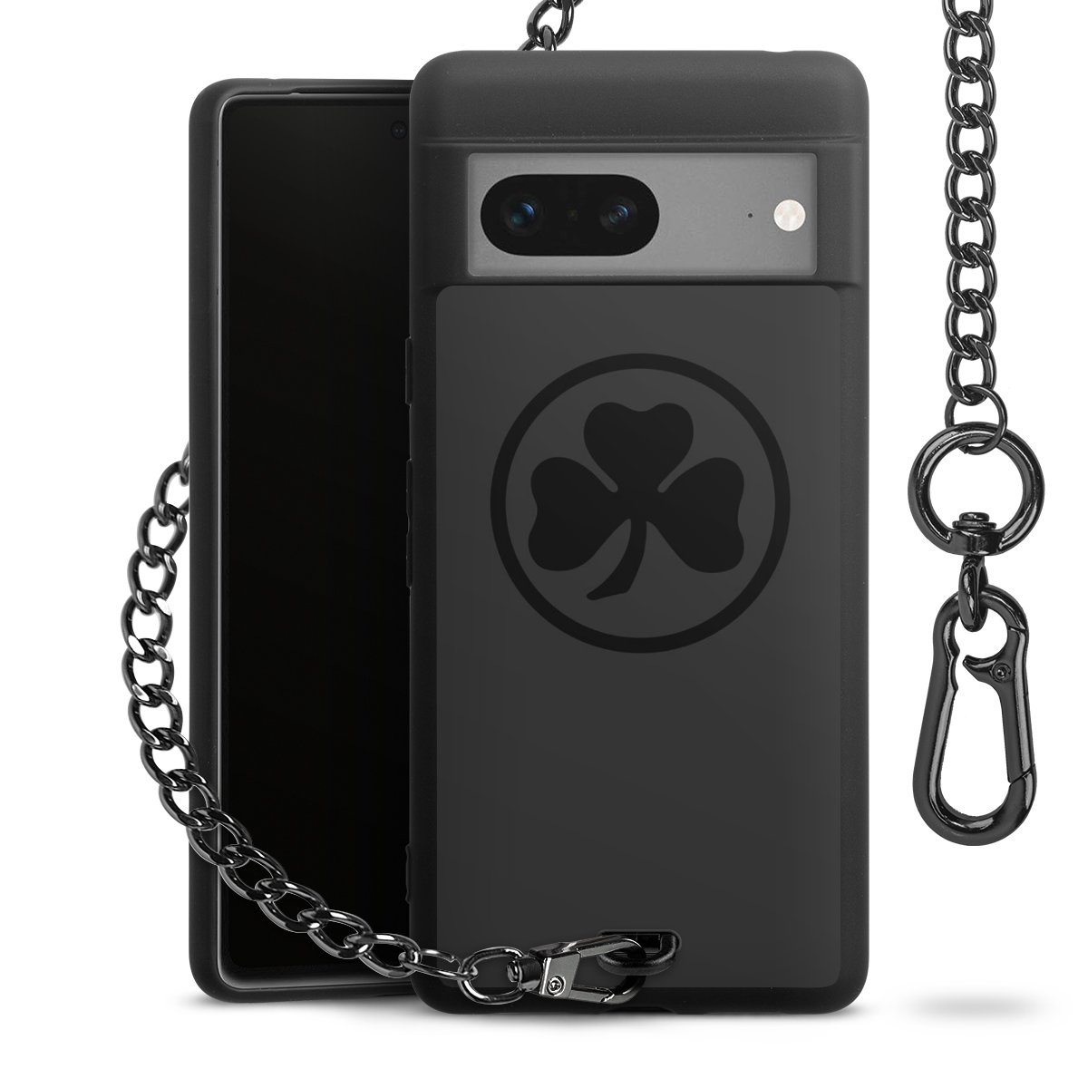 Die mattschwarze Silikon-Handyhülle besteht aus robustem TPU (thermoplastisches Polyurethan). Sie ist flexibel und schützt Dein Smartphone vor Stößen und Kratzern. Die Kette sowie der Karabinerhaken sind aus Metall in Gunmetal-Optik gefertigt. Für dieses Produkt kommen ausschließlich TÜV-geprüfte Materialien zum Einsatz.