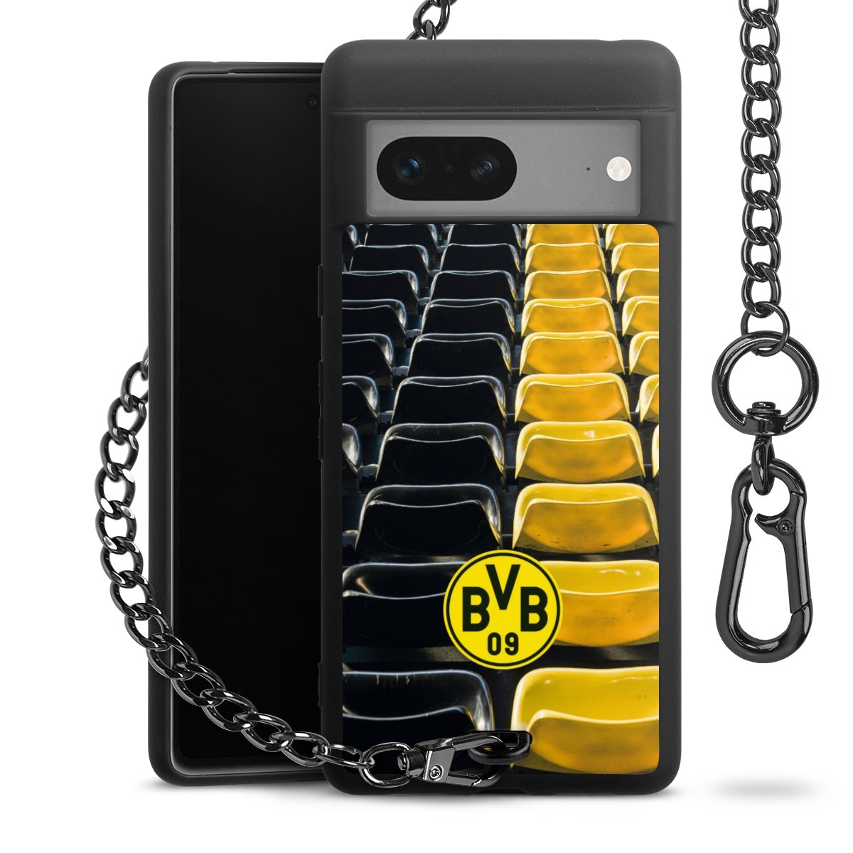 Die mattschwarze Silikon-Handyhülle besteht aus robustem TPU (thermoplastisches Polyurethan). Sie ist flexibel und schützt Dein Smartphone vor Stößen und Kratzern. Die Kette sowie der Karabinerhaken sind aus Metall in Gunmetal-Optik gefertigt. Für dieses Produkt kommen ausschließlich TÜV-geprüfte Materialien zum Einsatz.