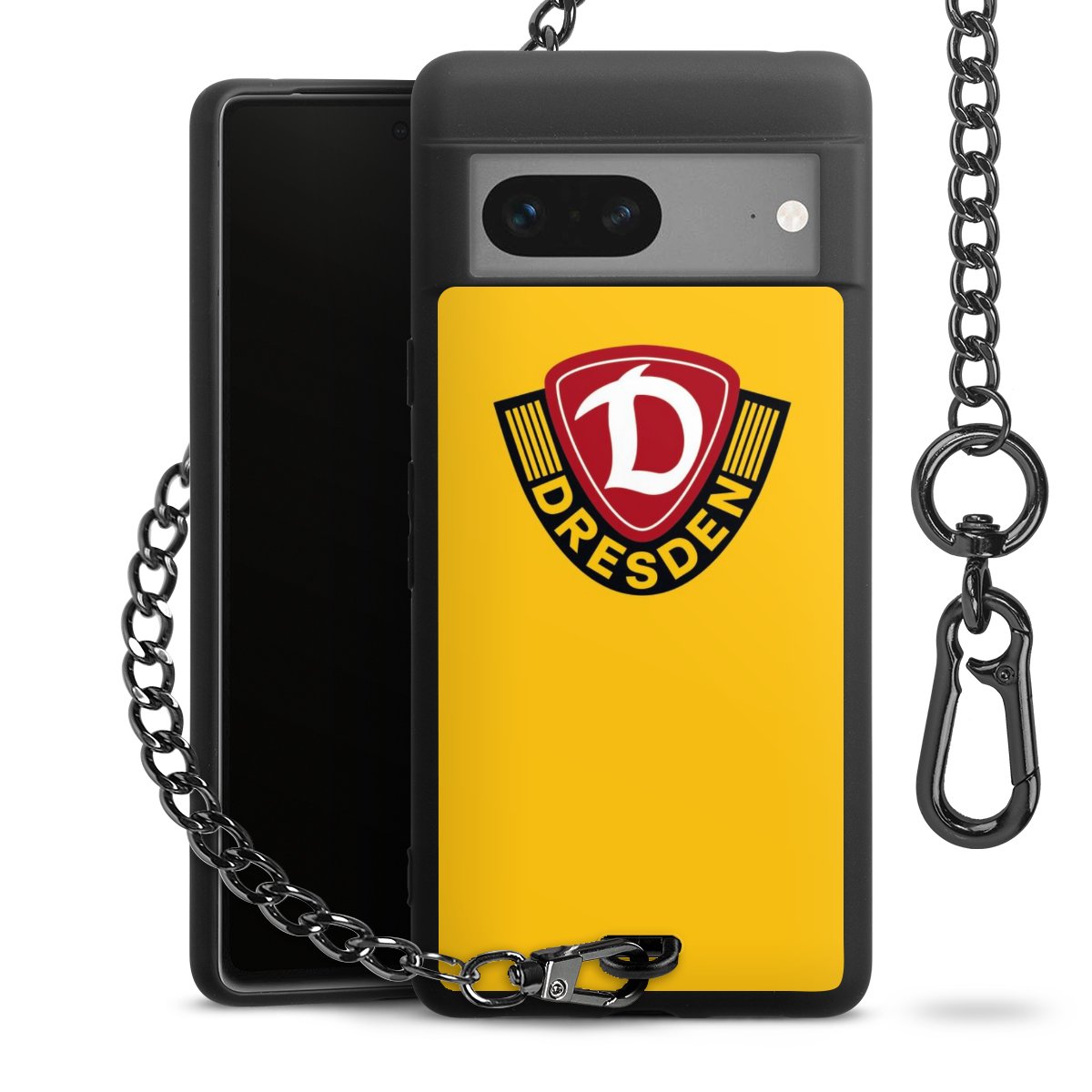 Die mattschwarze Silikon-Handyhülle besteht aus robustem TPU (thermoplastisches Polyurethan). Sie ist flexibel und schützt Dein Smartphone vor Stößen und Kratzern. Die Kette sowie der Karabinerhaken sind aus Metall in Gunmetal-Optik gefertigt. Für dieses Produkt kommen ausschließlich TÜV-geprüfte Materialien zum Einsatz.