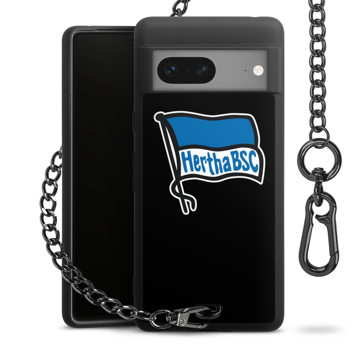 Die mattschwarze Silikon-Handyhülle besteht aus robustem TPU (thermoplastisches Polyurethan). Sie ist flexibel und schützt Dein Smartphone vor Stößen und Kratzern. Die Kette sowie der Karabinerhaken sind aus Metall in Gunmetal-Optik gefertigt. Für dieses Produkt kommen ausschließlich TÜV-geprüfte Materialien zum Einsatz.