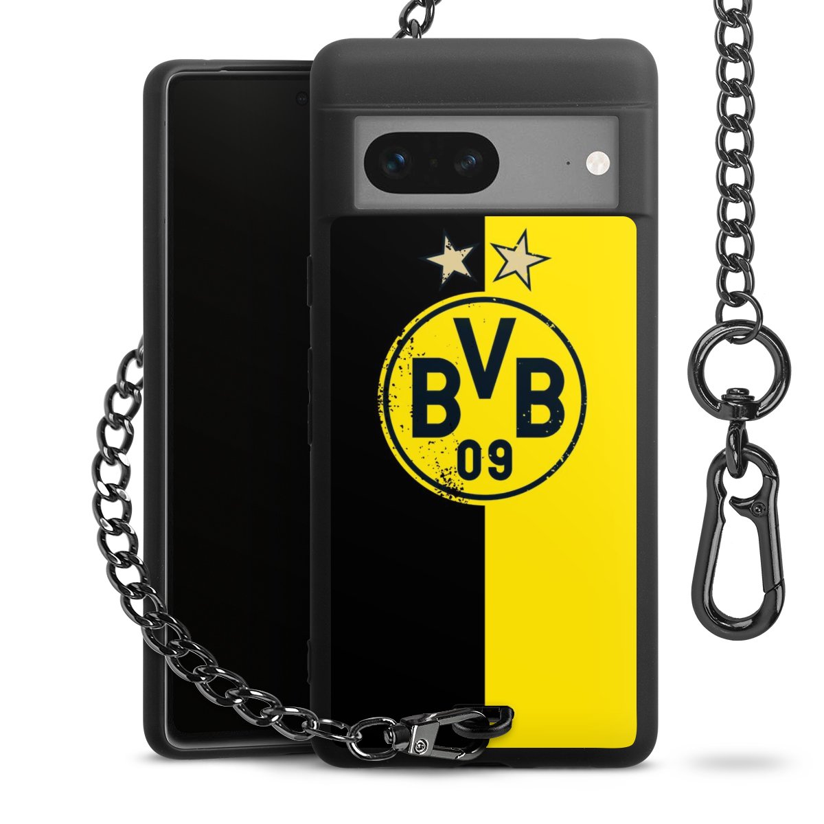 Die mattschwarze Silikon-Handyhülle besteht aus robustem TPU (thermoplastisches Polyurethan). Sie ist flexibel und schützt Dein Smartphone vor Stößen und Kratzern. Die Kette sowie der Karabinerhaken sind aus Metall in Gunmetal-Optik gefertigt. Für dieses Produkt kommen ausschließlich TÜV-geprüfte Materialien zum Einsatz.