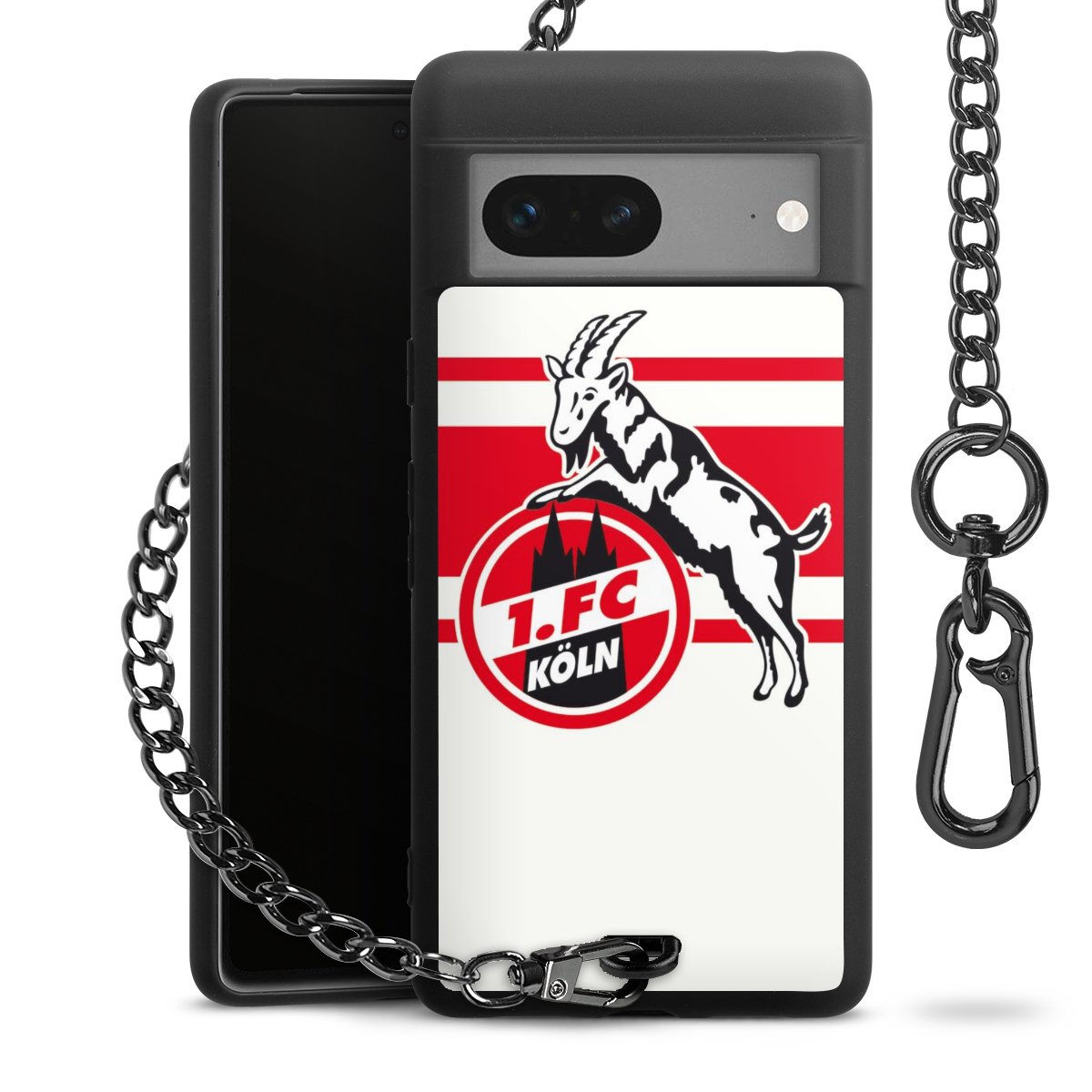 Die Handyhülle verfügt über eine mittig am unteren Rand platzierte Öse, an der die Metallkette stabil befestigt ist. Bestelle die Hülle einfach für Dein Smartphone-Modell, dann passt sie wie angegossen und Du brauchst sie bloß einmal anzudrücken. Handy in die Tasche, Karabiner an den Hosenbund – schon kann die Party starten.