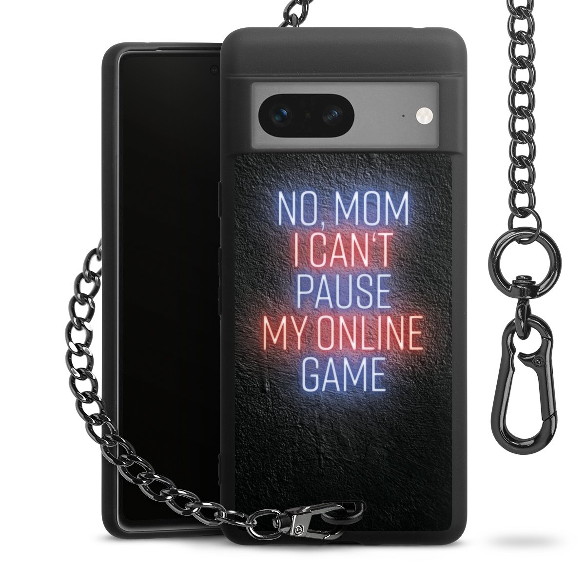 Die mattschwarze Silikon-Handyhülle besteht aus robustem TPU (thermoplastisches Polyurethan). Sie ist flexibel und schützt Dein Smartphone vor Stößen und Kratzern. Die Kette sowie der Karabinerhaken sind aus Metall in Gunmetal-Optik gefertigt. Für dieses Produkt kommen ausschließlich TÜV-geprüfte Materialien zum Einsatz.