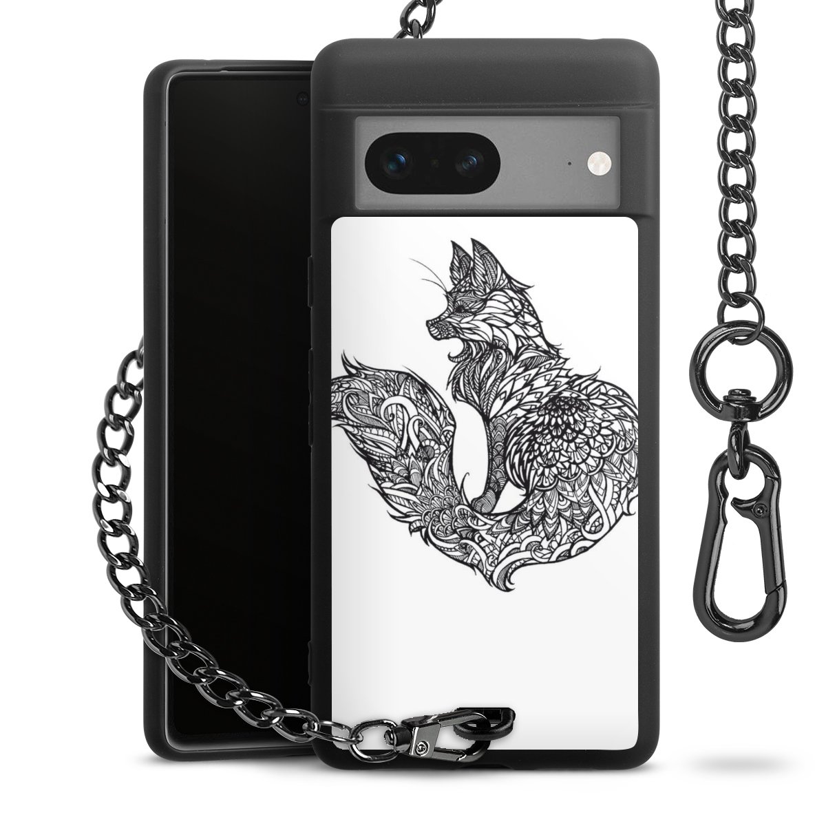Die mattschwarze Silikon-Handyhülle besteht aus robustem TPU (thermoplastisches Polyurethan). Sie ist flexibel und schützt Dein Smartphone vor Stößen und Kratzern. Die Kette sowie der Karabinerhaken sind aus Metall in Gunmetal-Optik gefertigt. Für dieses Produkt kommen ausschließlich TÜV-geprüfte Materialien zum Einsatz.