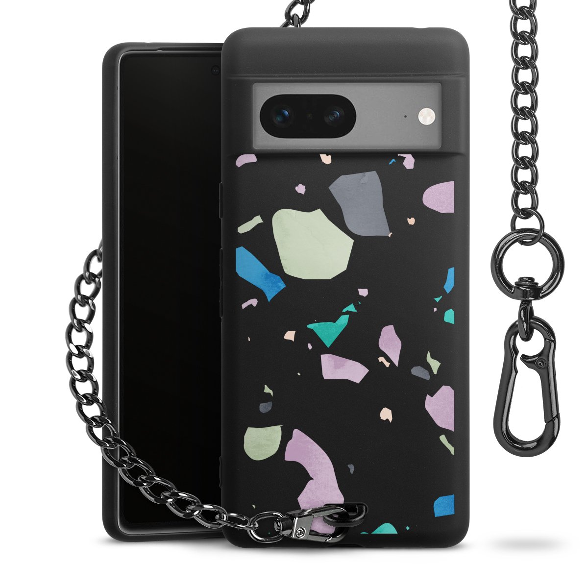 Die mattschwarze Silikon-Handyhülle besteht aus robustem TPU (thermoplastisches Polyurethan). Sie ist flexibel und schützt Dein Smartphone vor Stößen und Kratzern. Die Kette sowie der Karabinerhaken sind aus Metall in Gunmetal-Optik gefertigt. Für dieses Produkt kommen ausschließlich TÜV-geprüfte Materialien zum Einsatz.