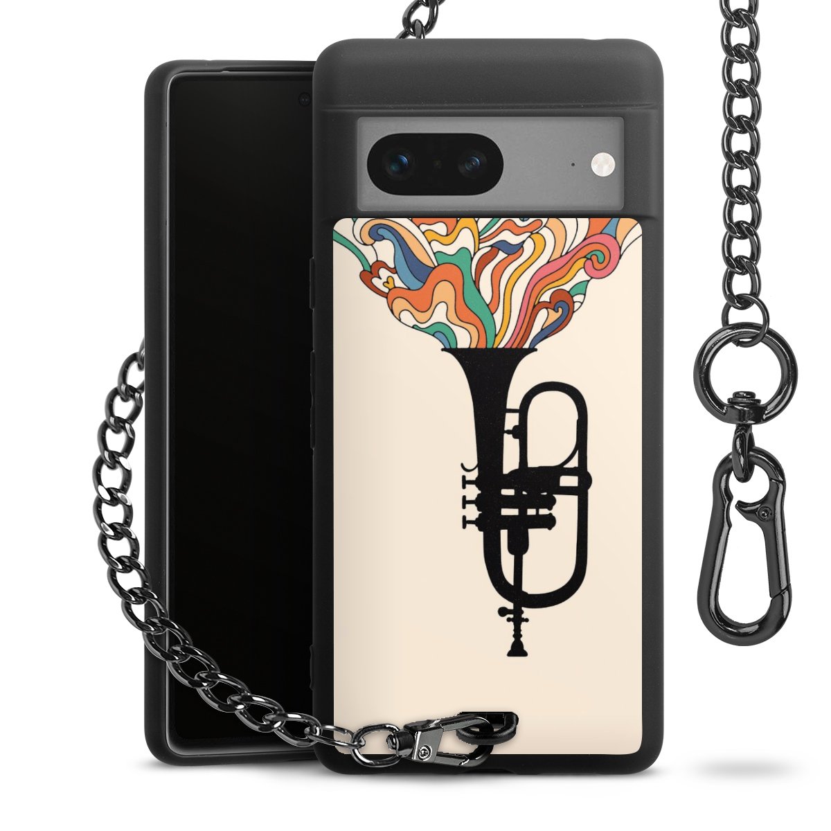 Die mattschwarze Silikon-Handyhülle besteht aus robustem TPU (thermoplastisches Polyurethan). Sie ist flexibel und schützt Dein Smartphone vor Stößen und Kratzern. Die Kette sowie der Karabinerhaken sind aus Metall in Gunmetal-Optik gefertigt. Für dieses Produkt kommen ausschließlich TÜV-geprüfte Materialien zum Einsatz.