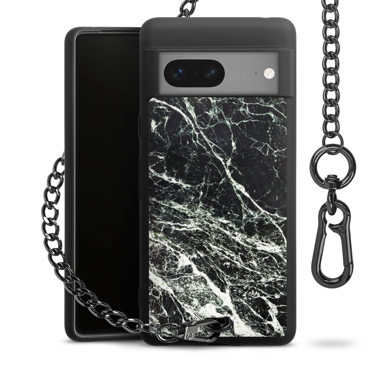 Die mattschwarze Silikon-Handyhülle besteht aus robustem TPU (thermoplastisches Polyurethan). Sie ist flexibel und schützt Dein Smartphone vor Stößen und Kratzern. Die Kette sowie der Karabinerhaken sind aus Metall in Gunmetal-Optik gefertigt. Für dieses Produkt kommen ausschließlich TÜV-geprüfte Materialien zum Einsatz.