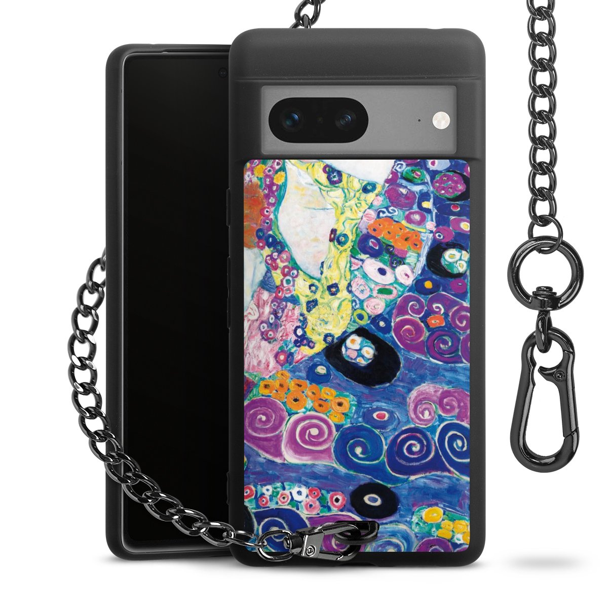 Die mattschwarze Silikon-Handyhülle besteht aus robustem TPU (thermoplastisches Polyurethan). Sie ist flexibel und schützt Dein Smartphone vor Stößen und Kratzern. Die Kette sowie der Karabinerhaken sind aus Metall in Gunmetal-Optik gefertigt. Für dieses Produkt kommen ausschließlich TÜV-geprüfte Materialien zum Einsatz.