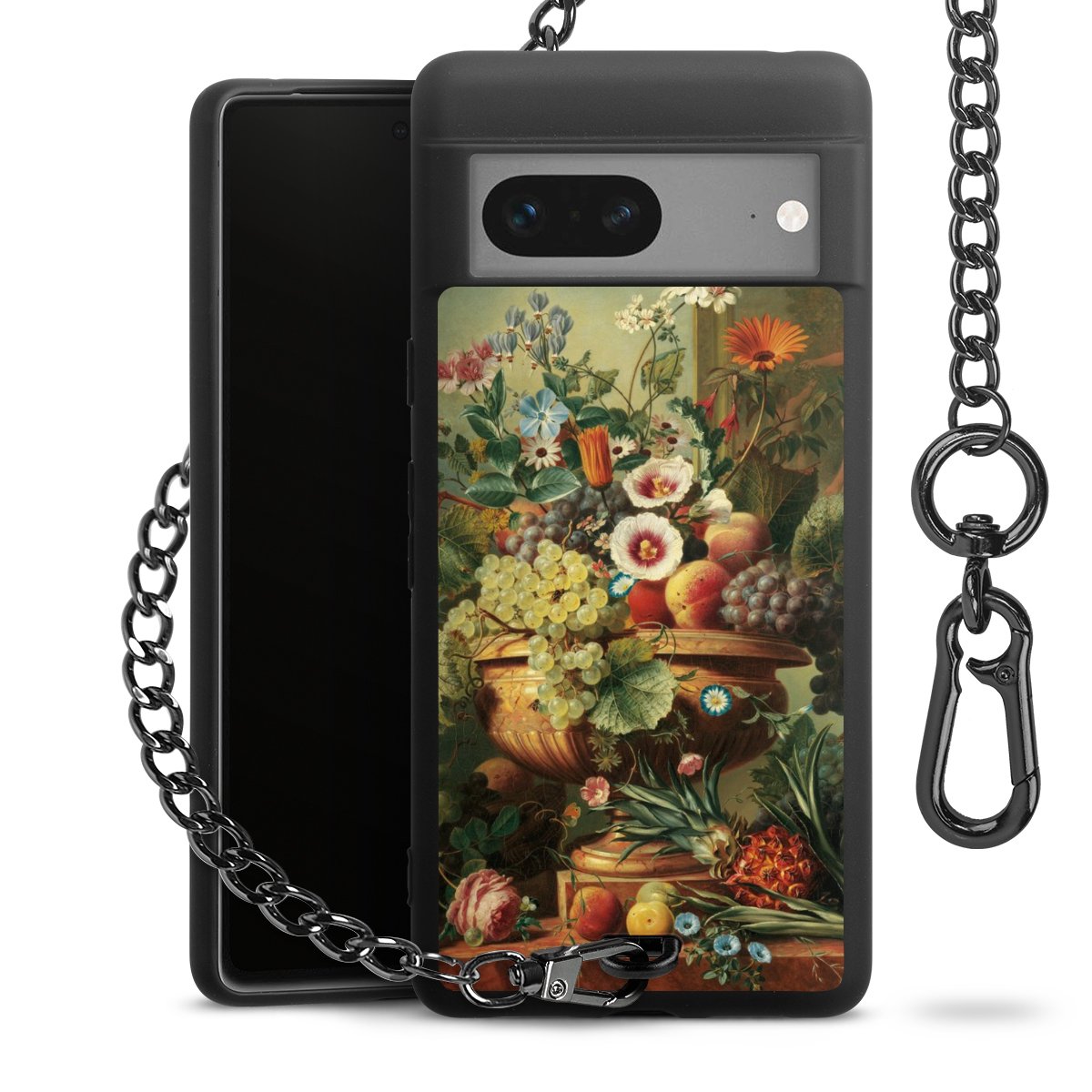 Die mattschwarze Silikon-Handyhülle besteht aus robustem TPU (thermoplastisches Polyurethan). Sie ist flexibel und schützt Dein Smartphone vor Stößen und Kratzern. Die Kette sowie der Karabinerhaken sind aus Metall in Gunmetal-Optik gefertigt. Für dieses Produkt kommen ausschließlich TÜV-geprüfte Materialien zum Einsatz.