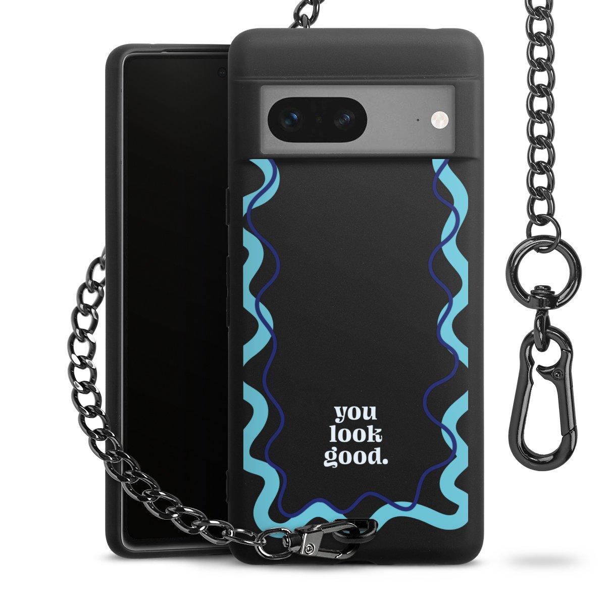 Die mattschwarze Silikon-Handyhülle besteht aus robustem TPU (thermoplastisches Polyurethan). Sie ist flexibel und schützt Dein Smartphone vor Stößen und Kratzern. Die Kette sowie der Karabinerhaken sind aus Metall in Gunmetal-Optik gefertigt. Für dieses Produkt kommen ausschließlich TÜV-geprüfte Materialien zum Einsatz.