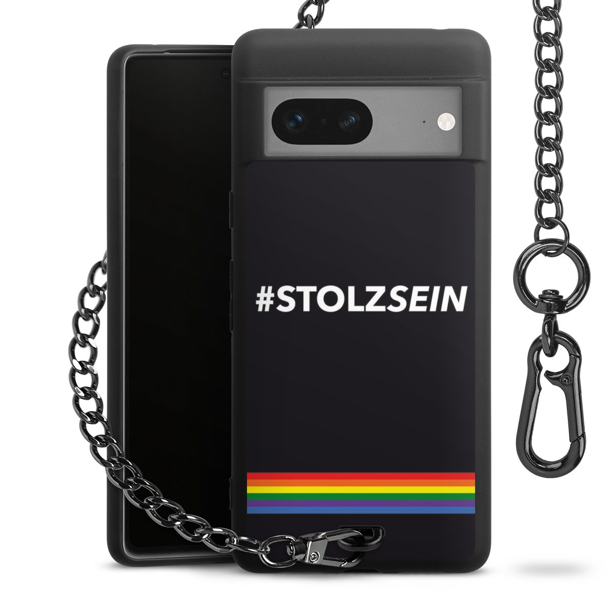 Die mattschwarze Silikon-Handyhülle besteht aus robustem TPU (thermoplastisches Polyurethan). Sie ist flexibel und schützt Dein Smartphone vor Stößen und Kratzern. Die Kette sowie der Karabinerhaken sind aus Metall in Gunmetal-Optik gefertigt. Für dieses Produkt kommen ausschließlich TÜV-geprüfte Materialien zum Einsatz.