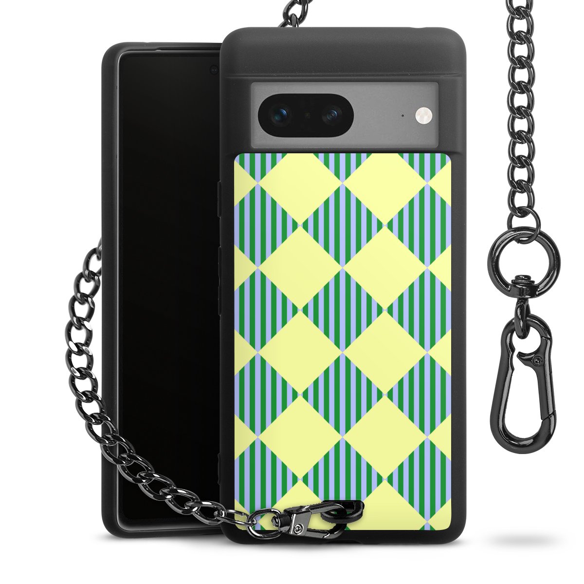 Die mattschwarze Silikon-Handyhülle besteht aus robustem TPU (thermoplastisches Polyurethan). Sie ist flexibel und schützt Dein Smartphone vor Stößen und Kratzern. Die Kette sowie der Karabinerhaken sind aus Metall in Gunmetal-Optik gefertigt. Für dieses Produkt kommen ausschließlich TÜV-geprüfte Materialien zum Einsatz.