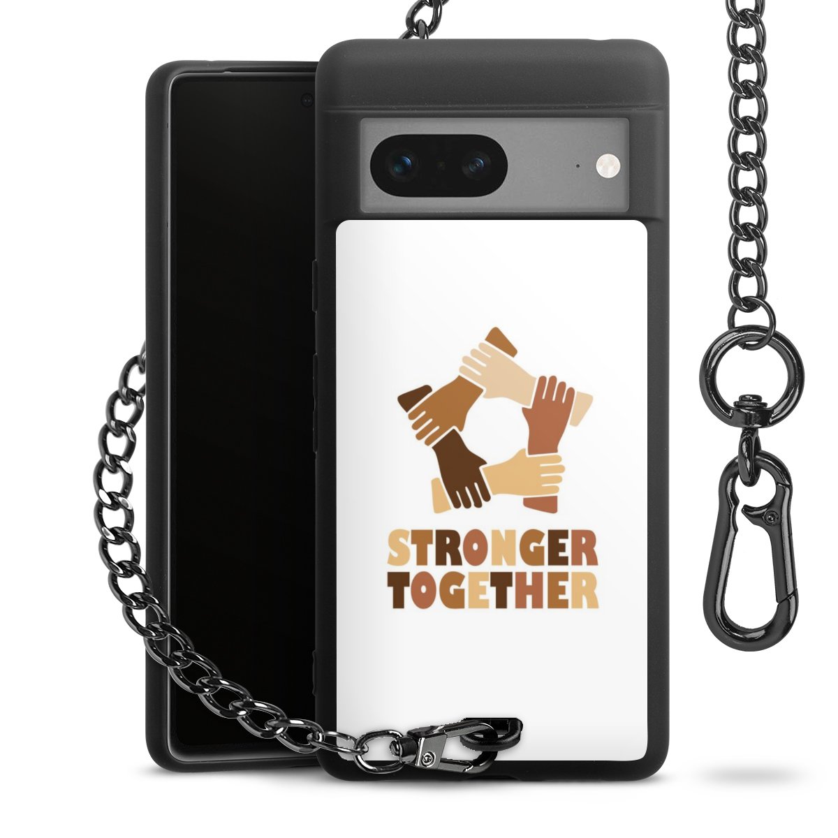 Die mattschwarze Silikon-Handyhülle besteht aus robustem TPU (thermoplastisches Polyurethan). Sie ist flexibel und schützt Dein Smartphone vor Stößen und Kratzern. Die Kette sowie der Karabinerhaken sind aus Metall in Gunmetal-Optik gefertigt. Für dieses Produkt kommen ausschließlich TÜV-geprüfte Materialien zum Einsatz.