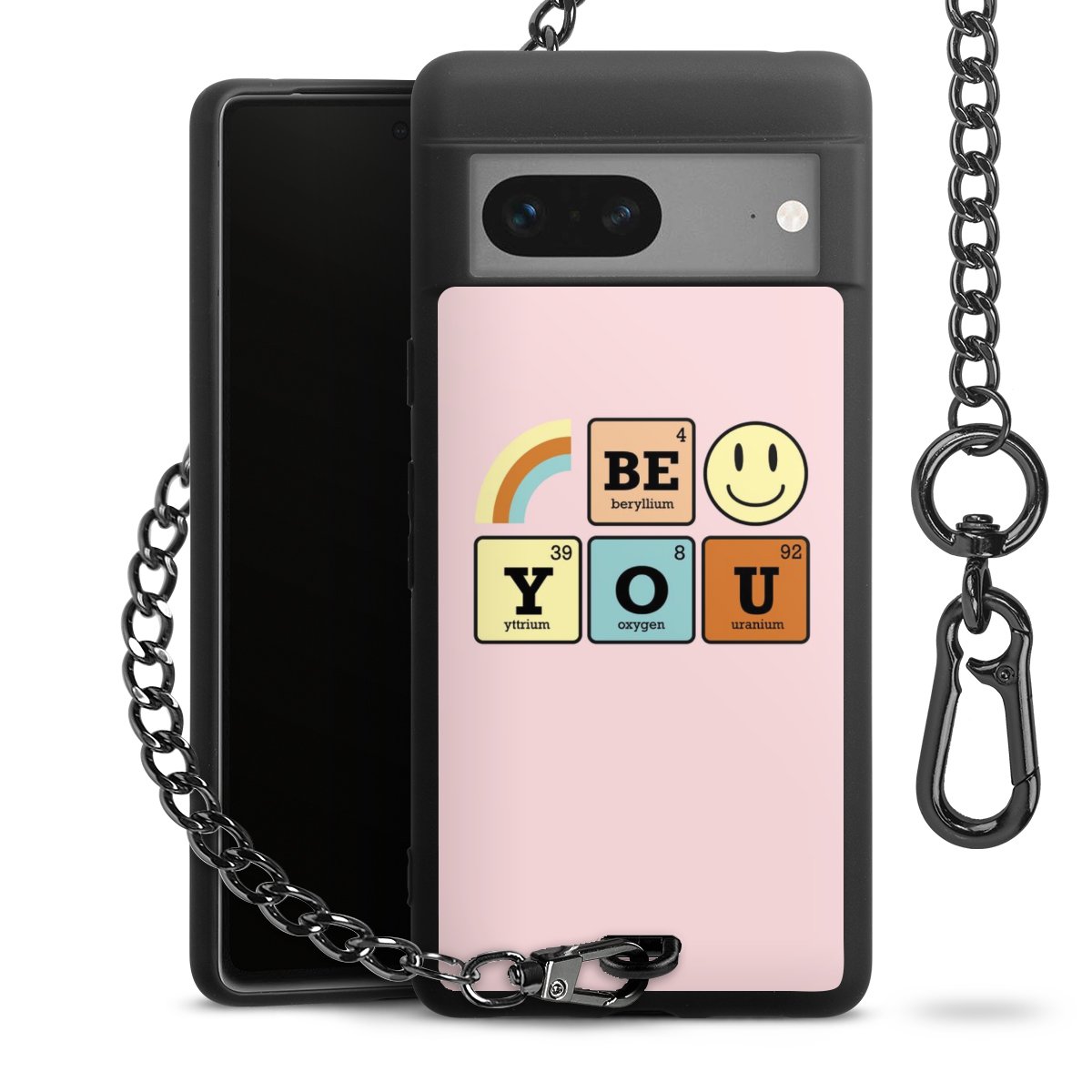 Die mattschwarze Silikon-Handyhülle besteht aus robustem TPU (thermoplastisches Polyurethan). Sie ist flexibel und schützt Dein Smartphone vor Stößen und Kratzern. Die Kette sowie der Karabinerhaken sind aus Metall in Gunmetal-Optik gefertigt. Für dieses Produkt kommen ausschließlich TÜV-geprüfte Materialien zum Einsatz.