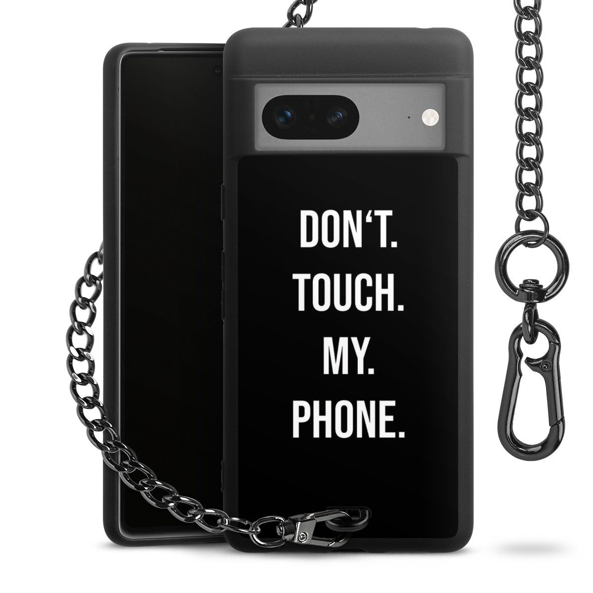 Die mattschwarze Silikon-Handyhülle besteht aus robustem TPU (thermoplastisches Polyurethan). Sie ist flexibel und schützt Dein Smartphone vor Stößen und Kratzern. Die Kette sowie der Karabinerhaken sind aus Metall in Gunmetal-Optik gefertigt. Für dieses Produkt kommen ausschließlich TÜV-geprüfte Materialien zum Einsatz.