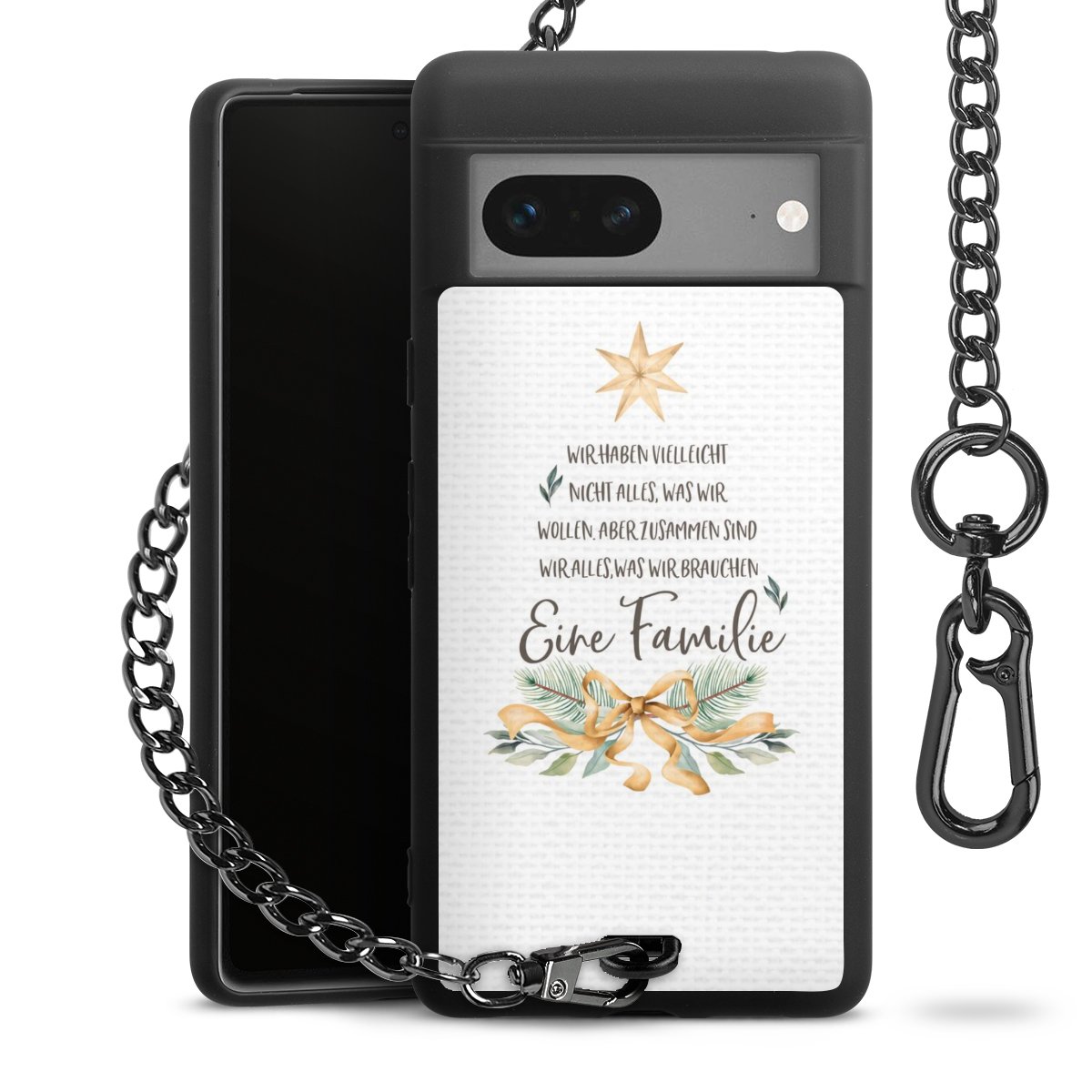 Die mattschwarze Silikon-Handyhülle besteht aus robustem TPU (thermoplastisches Polyurethan). Sie ist flexibel und schützt Dein Smartphone vor Stößen und Kratzern. Die Kette sowie der Karabinerhaken sind aus Metall in Gunmetal-Optik gefertigt. Für dieses Produkt kommen ausschließlich TÜV-geprüfte Materialien zum Einsatz.