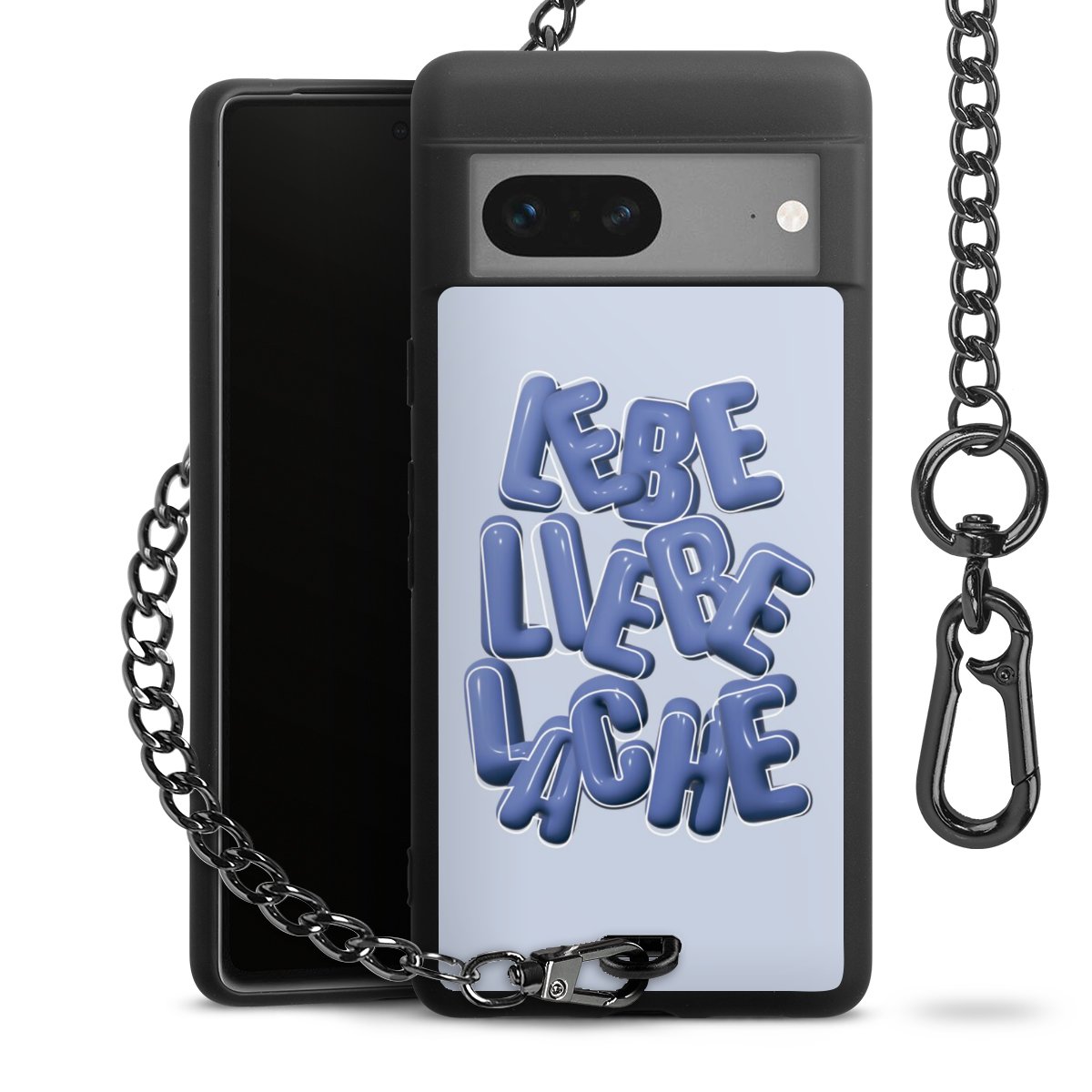 Die mattschwarze Silikon-Handyhülle besteht aus robustem TPU (thermoplastisches Polyurethan). Sie ist flexibel und schützt Dein Smartphone vor Stößen und Kratzern. Die Kette sowie der Karabinerhaken sind aus Metall in Gunmetal-Optik gefertigt. Für dieses Produkt kommen ausschließlich TÜV-geprüfte Materialien zum Einsatz.