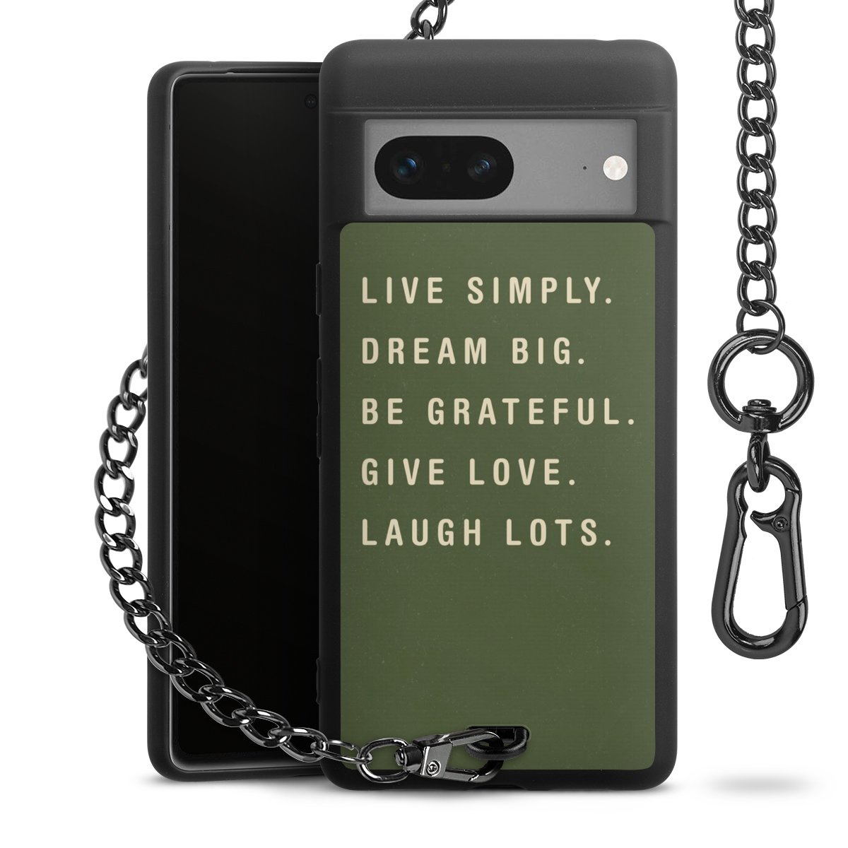 Die mattschwarze Silikon-Handyhülle besteht aus robustem TPU (thermoplastisches Polyurethan). Sie ist flexibel und schützt Dein Smartphone vor Stößen und Kratzern. Die Kette sowie der Karabinerhaken sind aus Metall in Gunmetal-Optik gefertigt. Für dieses Produkt kommen ausschließlich TÜV-geprüfte Materialien zum Einsatz.