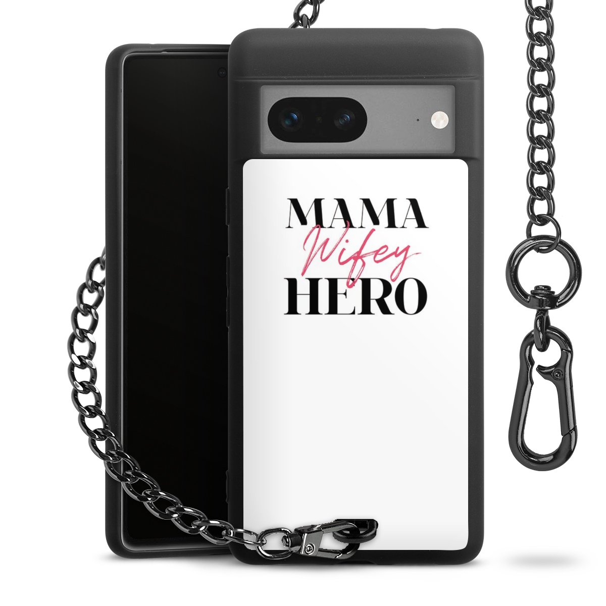 Die mattschwarze Silikon-Handyhülle besteht aus robustem TPU (thermoplastisches Polyurethan). Sie ist flexibel und schützt Dein Smartphone vor Stößen und Kratzern. Die Kette sowie der Karabinerhaken sind aus Metall in Gunmetal-Optik gefertigt. Für dieses Produkt kommen ausschließlich TÜV-geprüfte Materialien zum Einsatz.