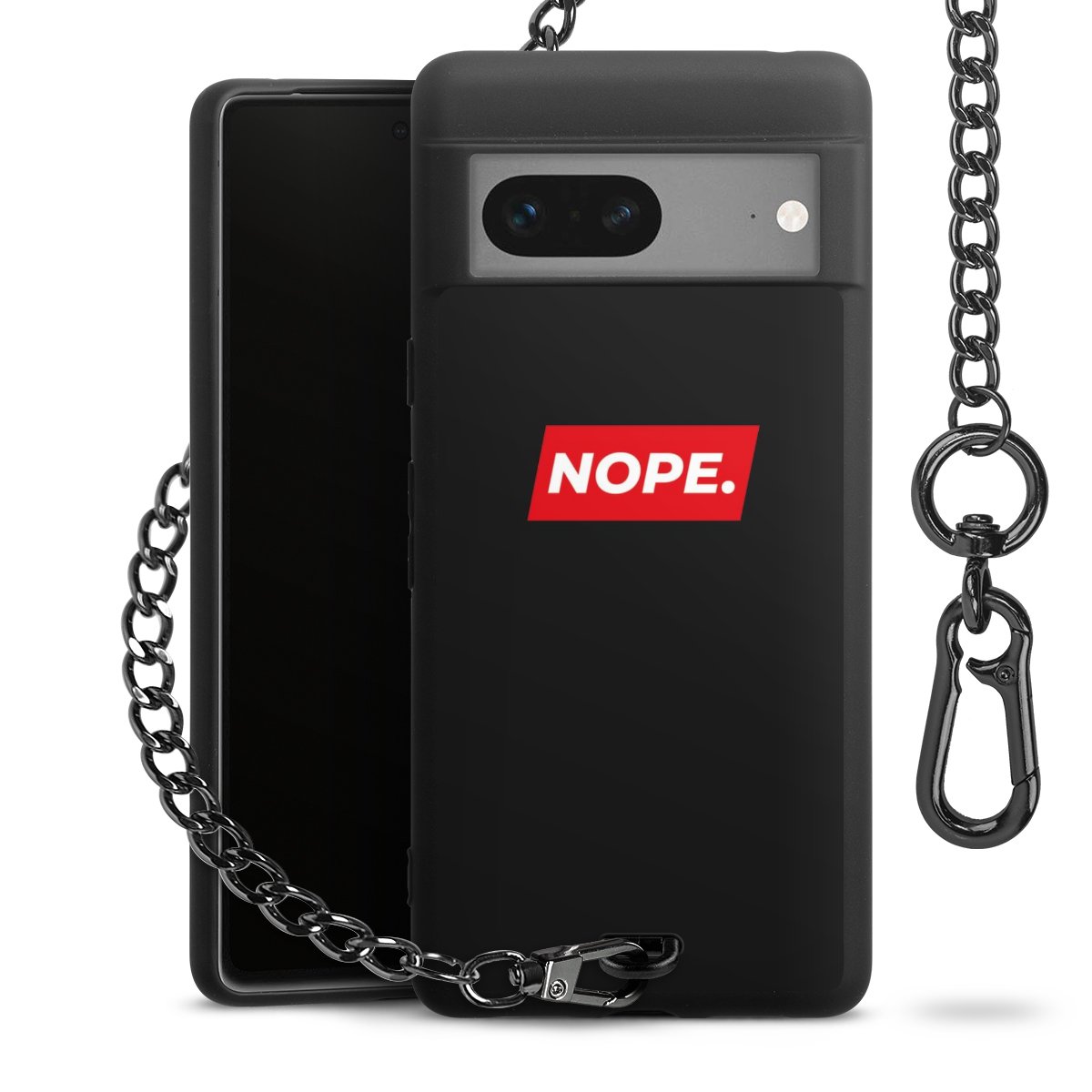 Die mattschwarze Silikon-Handyhülle besteht aus robustem TPU (thermoplastisches Polyurethan). Sie ist flexibel und schützt Dein Smartphone vor Stößen und Kratzern. Die Kette sowie der Karabinerhaken sind aus Metall in Gunmetal-Optik gefertigt. Für dieses Produkt kommen ausschließlich TÜV-geprüfte Materialien zum Einsatz.