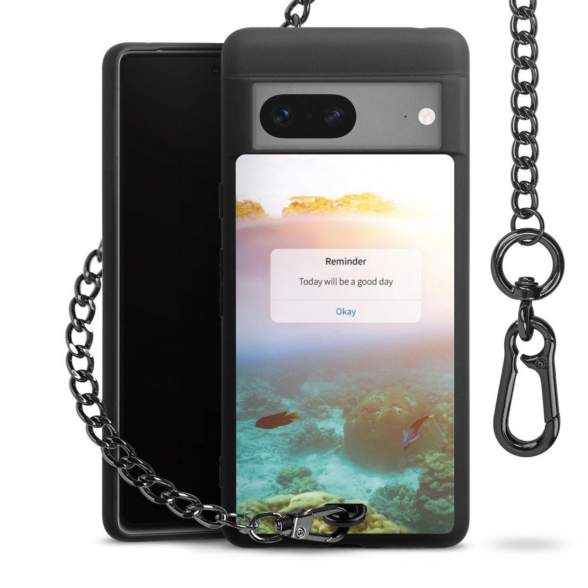 Die mattschwarze Silikon-Handyhülle besteht aus robustem TPU (thermoplastisches Polyurethan). Sie ist flexibel und schützt Dein Smartphone vor Stößen und Kratzern. Die Kette sowie der Karabinerhaken sind aus Metall in Gunmetal-Optik gefertigt. Für dieses Produkt kommen ausschließlich TÜV-geprüfte Materialien zum Einsatz.