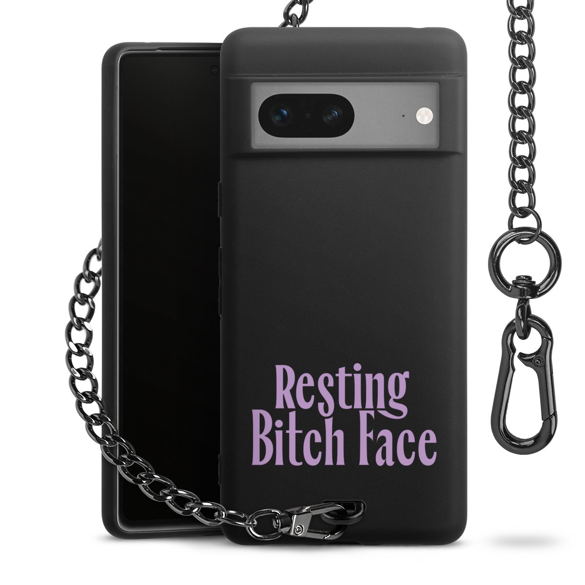 Die mattschwarze Silikon-Handyhülle besteht aus robustem TPU (thermoplastisches Polyurethan). Sie ist flexibel und schützt Dein Smartphone vor Stößen und Kratzern. Die Kette sowie der Karabinerhaken sind aus Metall in Gunmetal-Optik gefertigt. Für dieses Produkt kommen ausschließlich TÜV-geprüfte Materialien zum Einsatz.