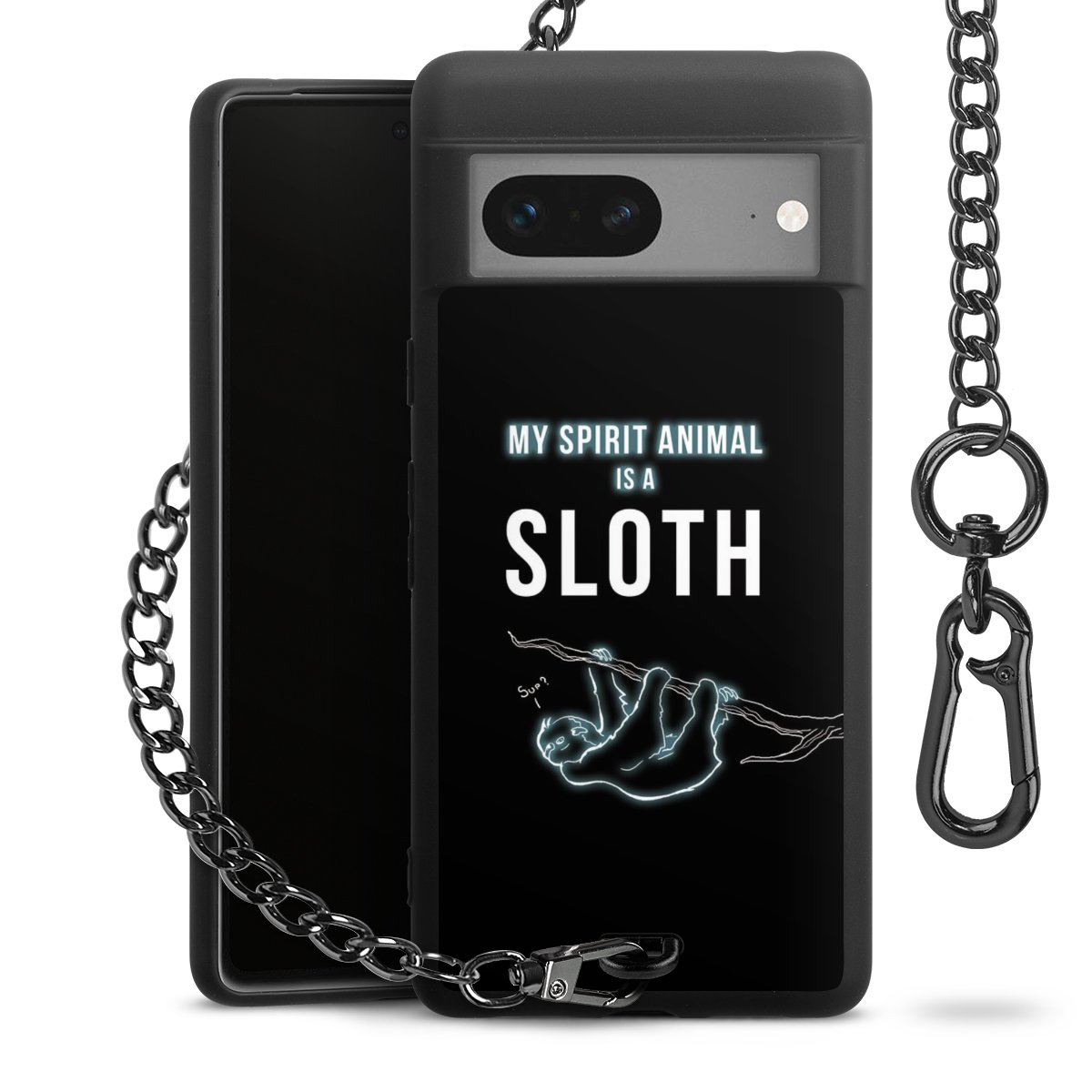 Die mattschwarze Silikon-Handyhülle besteht aus robustem TPU (thermoplastisches Polyurethan). Sie ist flexibel und schützt Dein Smartphone vor Stößen und Kratzern. Die Kette sowie der Karabinerhaken sind aus Metall in Gunmetal-Optik gefertigt. Für dieses Produkt kommen ausschließlich TÜV-geprüfte Materialien zum Einsatz.