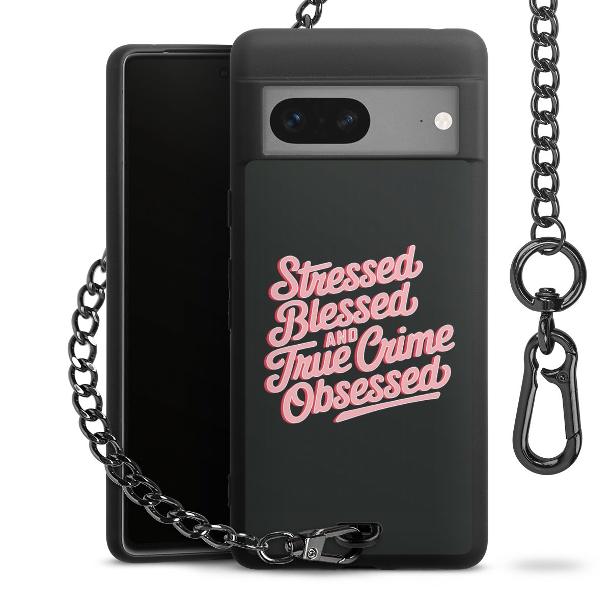 Die mattschwarze Silikon-Handyhülle besteht aus robustem TPU (thermoplastisches Polyurethan). Sie ist flexibel und schützt Dein Smartphone vor Stößen und Kratzern. Die Kette sowie der Karabinerhaken sind aus Metall in Gunmetal-Optik gefertigt. Für dieses Produkt kommen ausschließlich TÜV-geprüfte Materialien zum Einsatz.