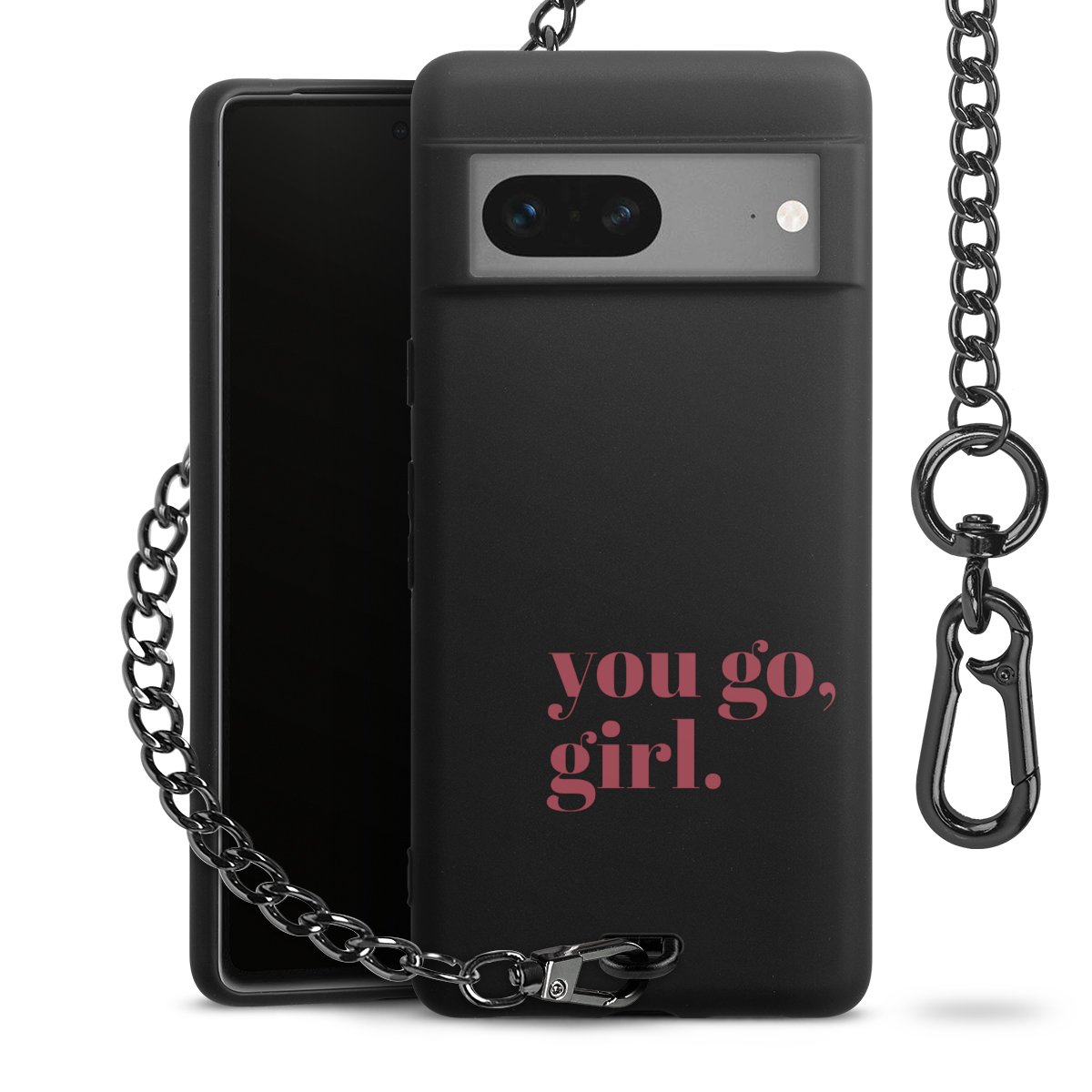 Die mattschwarze Silikon-Handyhülle besteht aus robustem TPU (thermoplastisches Polyurethan). Sie ist flexibel und schützt Dein Smartphone vor Stößen und Kratzern. Die Kette sowie der Karabinerhaken sind aus Metall in Gunmetal-Optik gefertigt. Für dieses Produkt kommen ausschließlich TÜV-geprüfte Materialien zum Einsatz.
