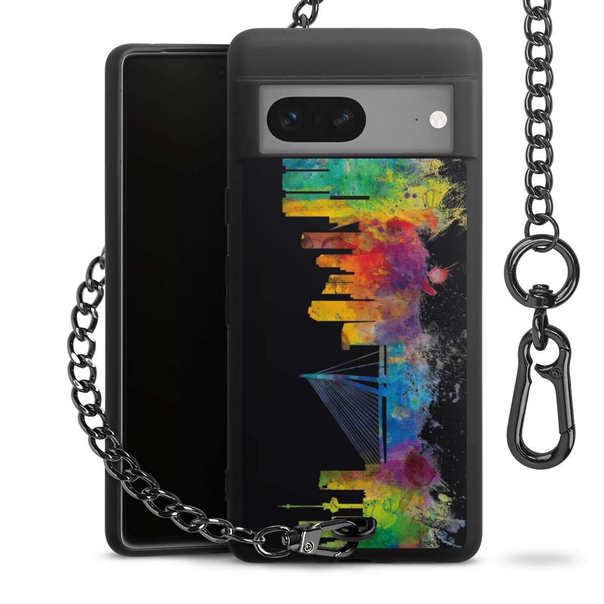 Die mattschwarze Silikon-Handyhülle besteht aus robustem TPU (thermoplastisches Polyurethan). Sie ist flexibel und schützt Dein Smartphone vor Stößen und Kratzern. Die Kette sowie der Karabinerhaken sind aus Metall in Gunmetal-Optik gefertigt. Für dieses Produkt kommen ausschließlich TÜV-geprüfte Materialien zum Einsatz.
