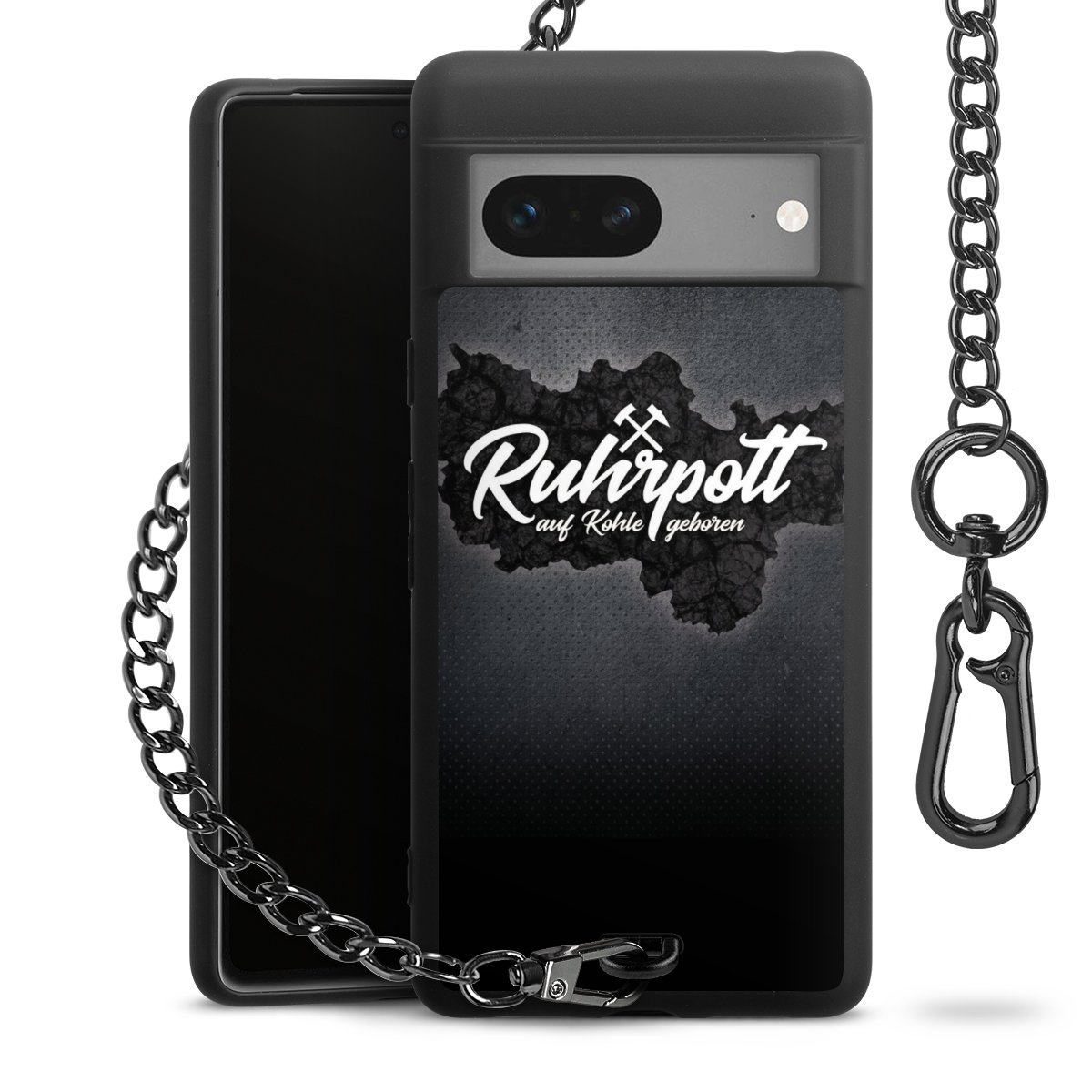 Die mattschwarze Silikon-Handyhülle besteht aus robustem TPU (thermoplastisches Polyurethan). Sie ist flexibel und schützt Dein Smartphone vor Stößen und Kratzern. Die Kette sowie der Karabinerhaken sind aus Metall in Gunmetal-Optik gefertigt. Für dieses Produkt kommen ausschließlich TÜV-geprüfte Materialien zum Einsatz.