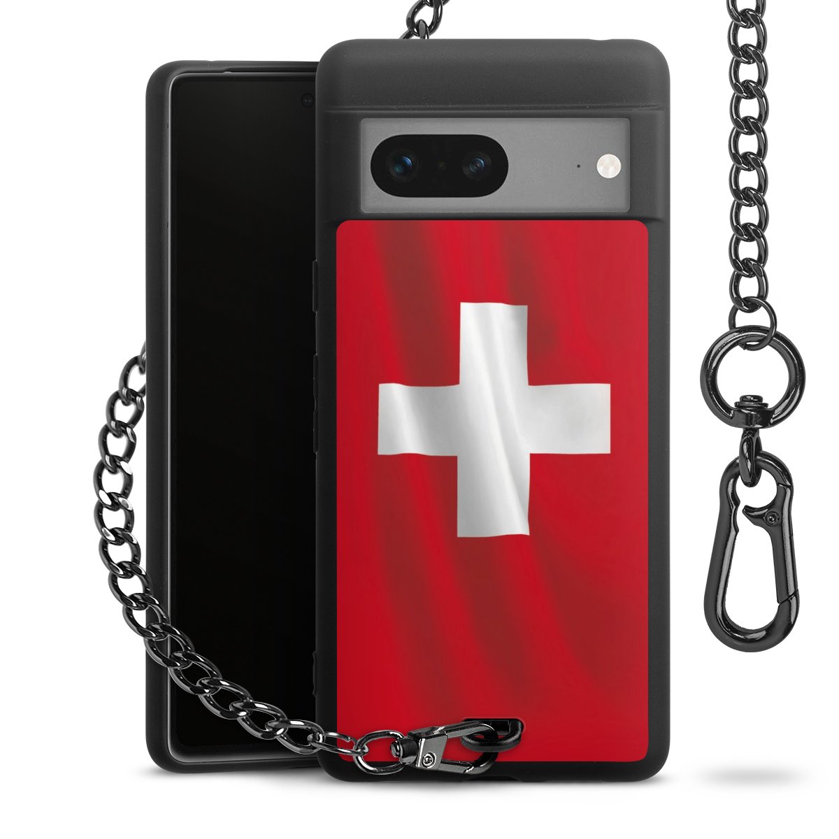 Die mattschwarze Silikon-Handyhülle besteht aus robustem TPU (thermoplastisches Polyurethan). Sie ist flexibel und schützt Dein Smartphone vor Stößen und Kratzern. Die Kette sowie der Karabinerhaken sind aus Metall in Gunmetal-Optik gefertigt. Für dieses Produkt kommen ausschließlich TÜV-geprüfte Materialien zum Einsatz.