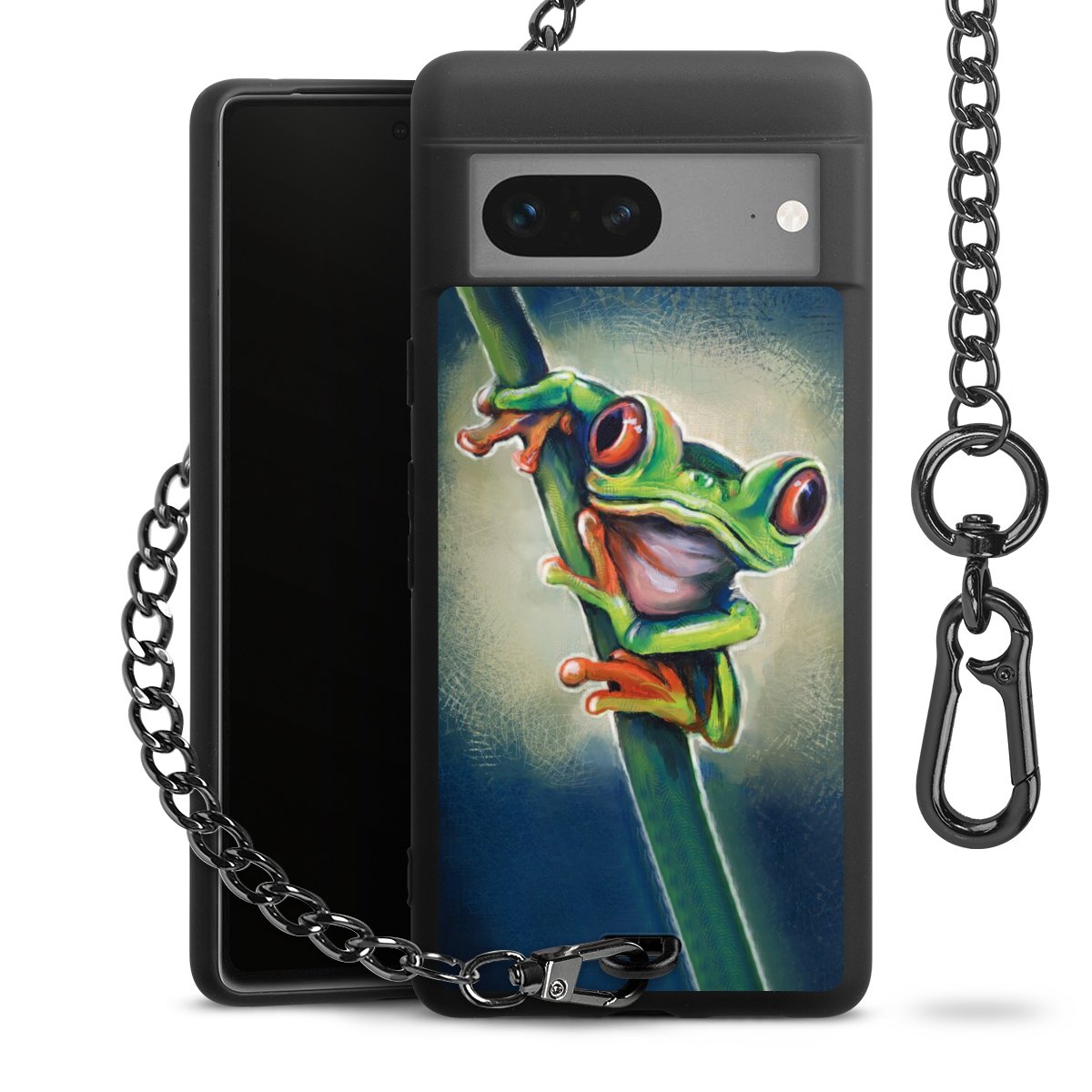 Die Handyhülle verfügt über eine mittig am unteren Rand platzierte Öse, an der die Metallkette stabil befestigt ist. Bestelle die Hülle einfach für Dein Smartphone-Modell, dann passt sie wie angegossen und Du brauchst sie bloß einmal anzudrücken. Handy in die Tasche, Karabiner an den Hosenbund – schon kann die Party starten.