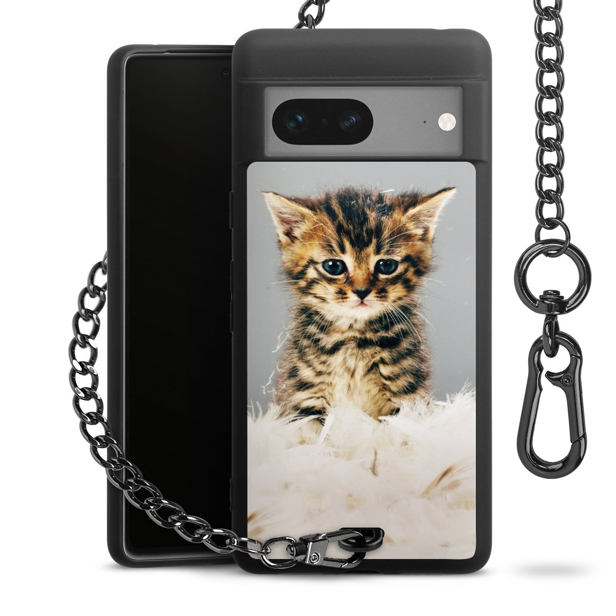 Die mattschwarze Silikon-Handyhülle besteht aus robustem TPU (thermoplastisches Polyurethan). Sie ist flexibel und schützt Dein Smartphone vor Stößen und Kratzern. Die Kette sowie der Karabinerhaken sind aus Metall in Gunmetal-Optik gefertigt. Für dieses Produkt kommen ausschließlich TÜV-geprüfte Materialien zum Einsatz.