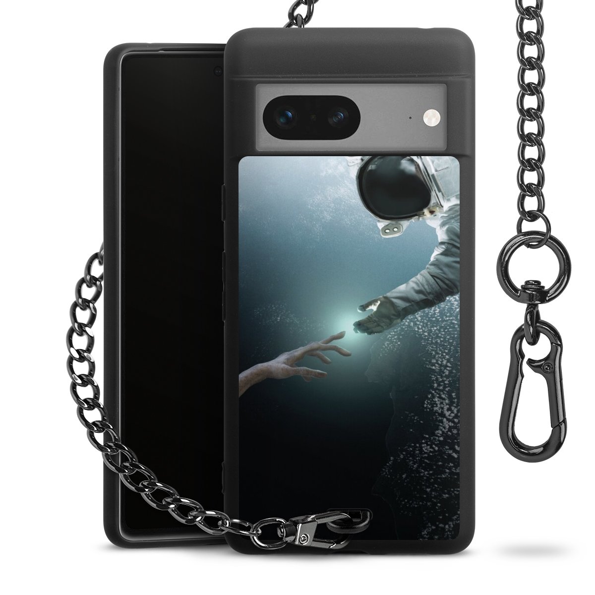 Die mattschwarze Silikon-Handyhülle besteht aus robustem TPU (thermoplastisches Polyurethan). Sie ist flexibel und schützt Dein Smartphone vor Stößen und Kratzern. Die Kette sowie der Karabinerhaken sind aus Metall in Gunmetal-Optik gefertigt. Für dieses Produkt kommen ausschließlich TÜV-geprüfte Materialien zum Einsatz.