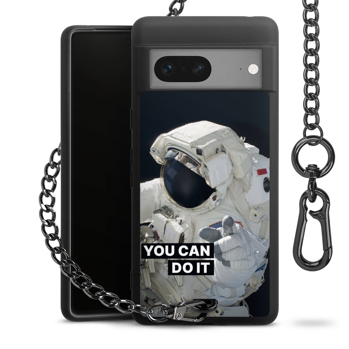 Die mattschwarze Silikon-Handyhülle besteht aus robustem TPU (thermoplastisches Polyurethan). Sie ist flexibel und schützt Dein Smartphone vor Stößen und Kratzern. Die Kette sowie der Karabinerhaken sind aus Metall in Gunmetal-Optik gefertigt. Für dieses Produkt kommen ausschließlich TÜV-geprüfte Materialien zum Einsatz.