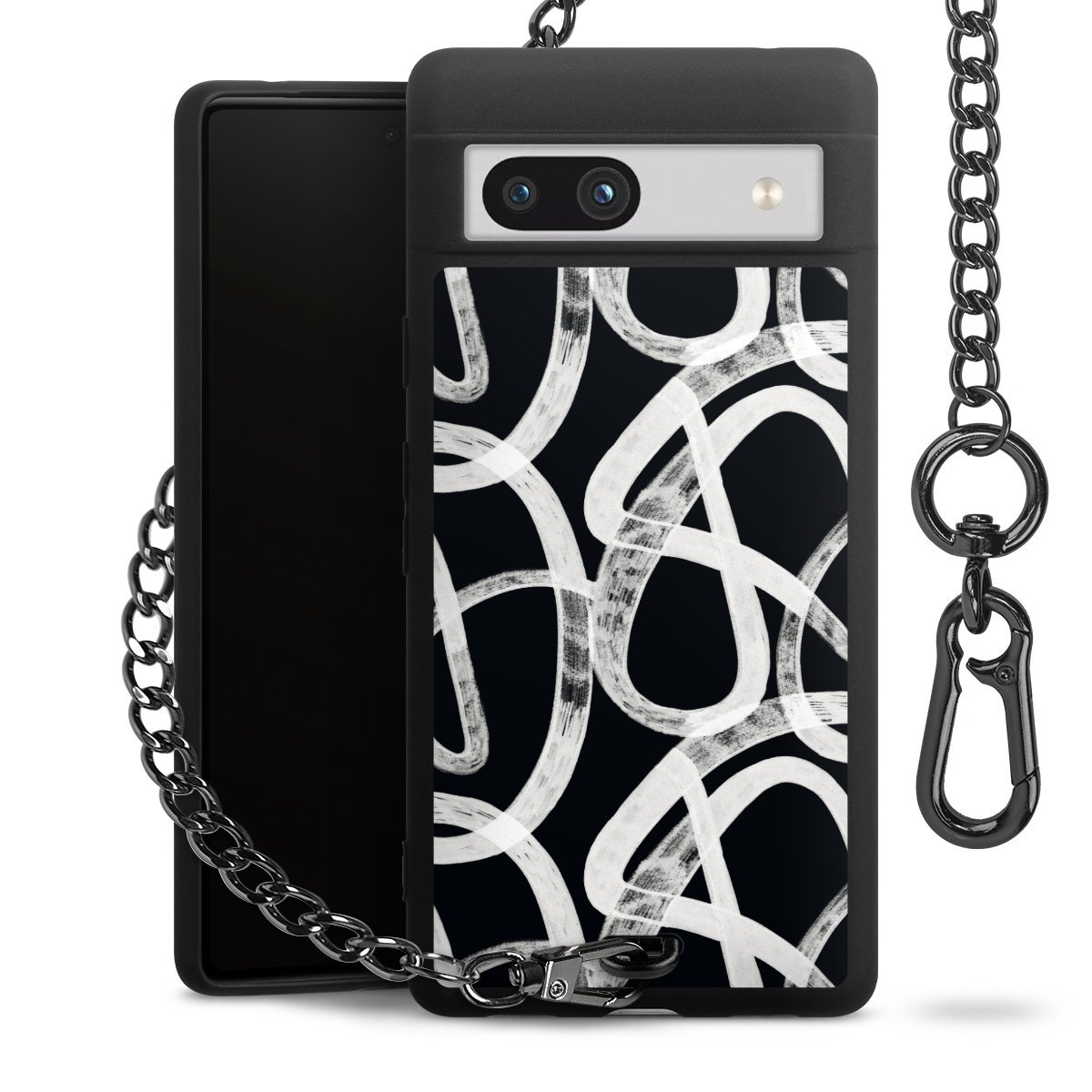 Die mattschwarze Silikon-Handyhülle besteht aus robustem TPU (thermoplastisches Polyurethan). Sie ist flexibel und schützt Dein Smartphone vor Stößen und Kratzern. Die Kette sowie der Karabinerhaken sind aus Metall in Gunmetal-Optik gefertigt. Für dieses Produkt kommen ausschließlich TÜV-geprüfte Materialien zum Einsatz.
