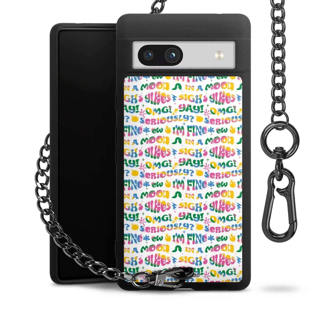 Die mattschwarze Silikon-Handyhülle besteht aus robustem TPU (thermoplastisches Polyurethan). Sie ist flexibel und schützt Dein Smartphone vor Stößen und Kratzern. Die Kette sowie der Karabinerhaken sind aus Metall in Gunmetal-Optik gefertigt. Für dieses Produkt kommen ausschließlich TÜV-geprüfte Materialien zum Einsatz.