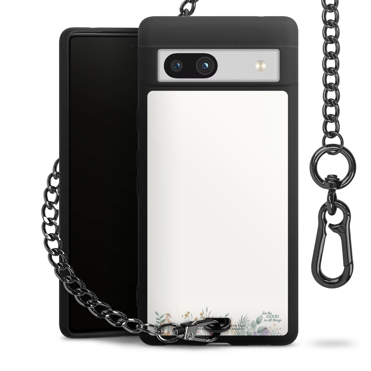 Die mattschwarze Silikon-Handyhülle besteht aus robustem TPU (thermoplastisches Polyurethan). Sie ist flexibel und schützt Dein Smartphone vor Stößen und Kratzern. Die Kette sowie der Karabinerhaken sind aus Metall in Gunmetal-Optik gefertigt. Für dieses Produkt kommen ausschließlich TÜV-geprüfte Materialien zum Einsatz.