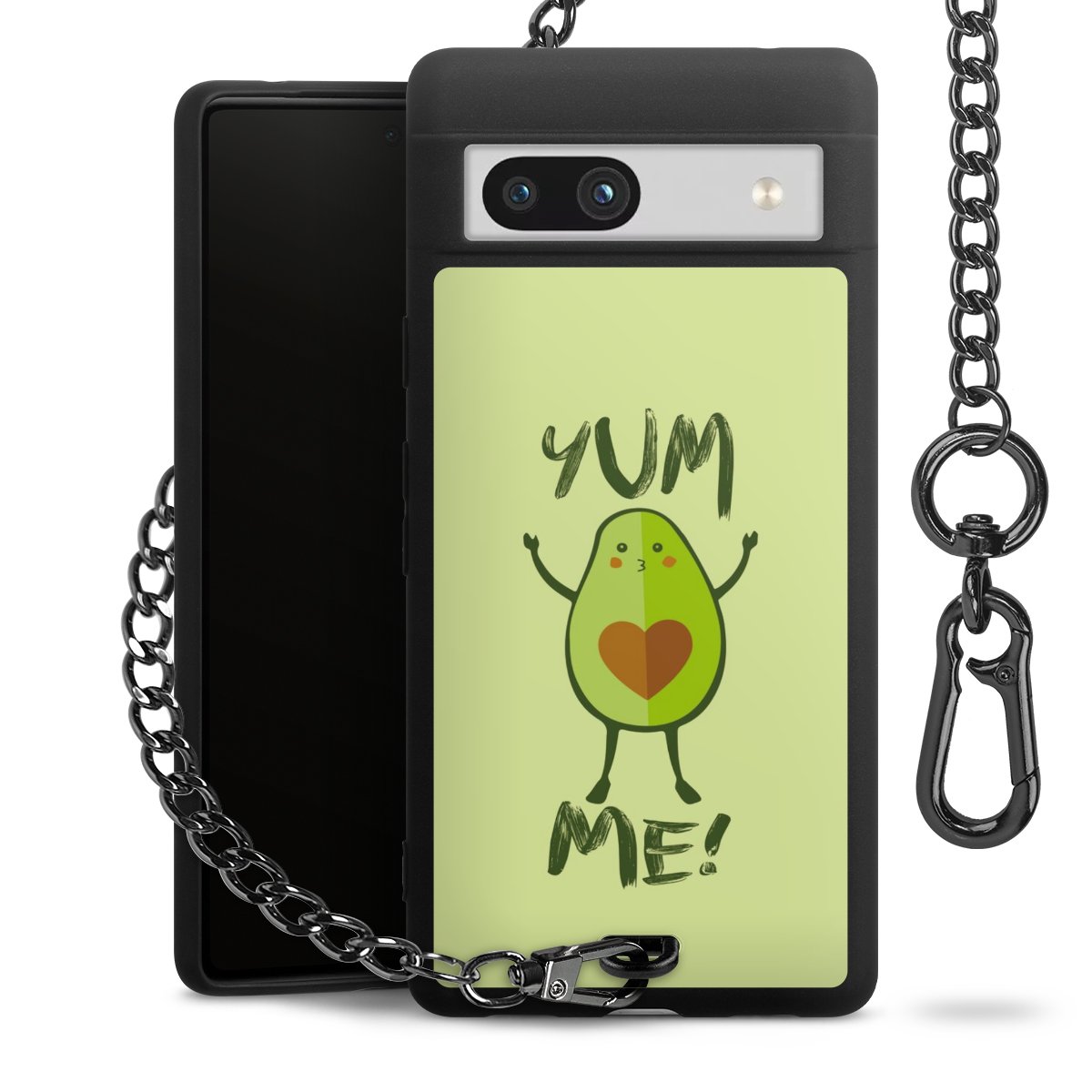 Die mattschwarze Silikon-Handyhülle besteht aus robustem TPU (thermoplastisches Polyurethan). Sie ist flexibel und schützt Dein Smartphone vor Stößen und Kratzern. Die Kette sowie der Karabinerhaken sind aus Metall in Gunmetal-Optik gefertigt. Für dieses Produkt kommen ausschließlich TÜV-geprüfte Materialien zum Einsatz.