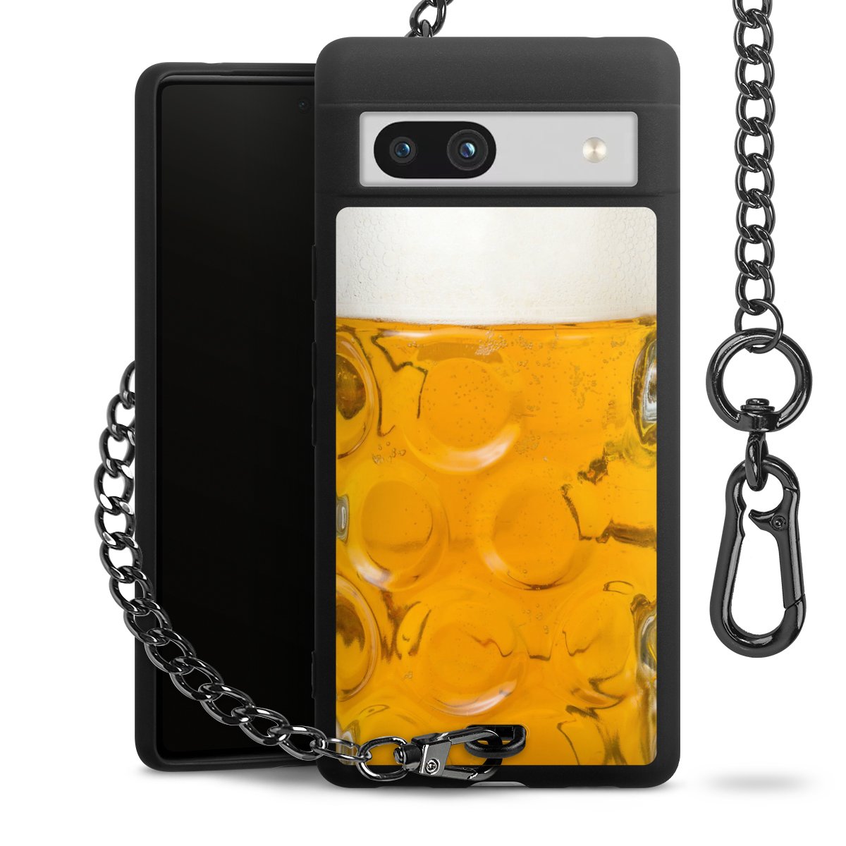 Die Handyhülle verfügt über eine mittig am unteren Rand platzierte Öse, an der die Metallkette stabil befestigt ist. Bestelle die Hülle einfach für Dein Smartphone-Modell, dann passt sie wie angegossen und Du brauchst sie bloß einmal anzudrücken. Handy in die Tasche, Karabiner an den Hosenbund – schon kann die Party starten.