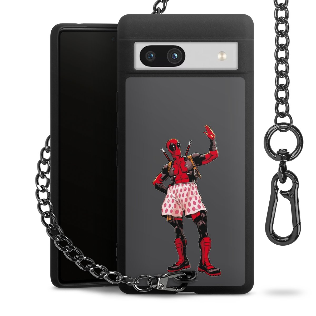 Die mattschwarze Silikon-Handyhülle besteht aus robustem TPU (thermoplastisches Polyurethan). Sie ist flexibel und schützt Dein Smartphone vor Stößen und Kratzern. Die Kette sowie der Karabinerhaken sind aus Metall in Gunmetal-Optik gefertigt. Für dieses Produkt kommen ausschließlich TÜV-geprüfte Materialien zum Einsatz.