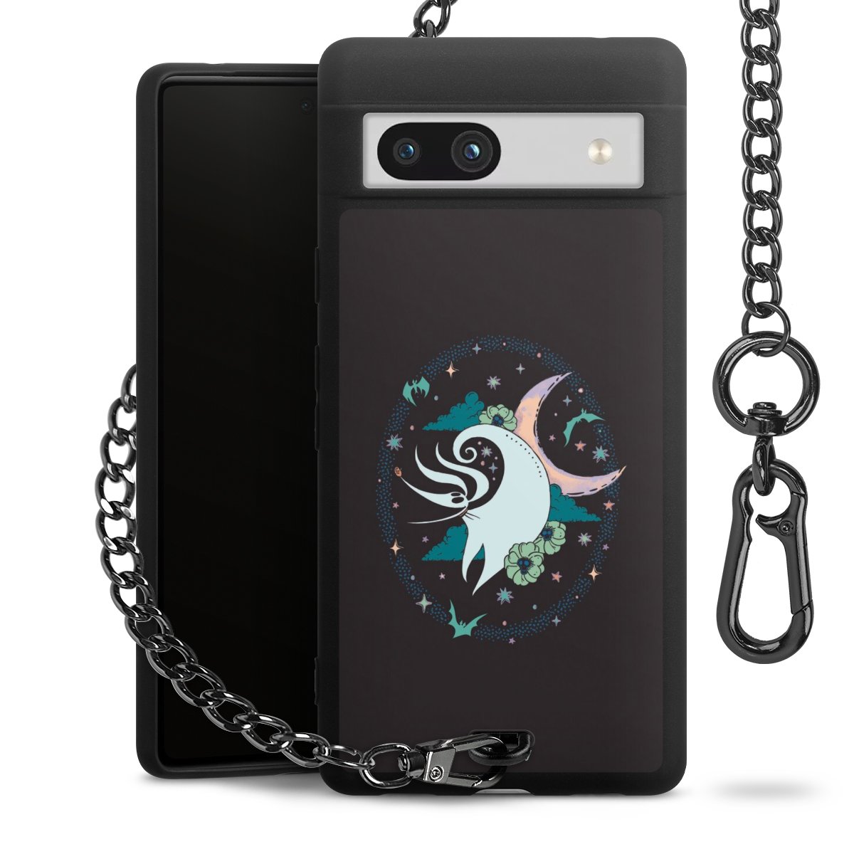 Die mattschwarze Silikon-Handyhülle besteht aus robustem TPU (thermoplastisches Polyurethan). Sie ist flexibel und schützt Dein Smartphone vor Stößen und Kratzern. Die Kette sowie der Karabinerhaken sind aus Metall in Gunmetal-Optik gefertigt. Für dieses Produkt kommen ausschließlich TÜV-geprüfte Materialien zum Einsatz.