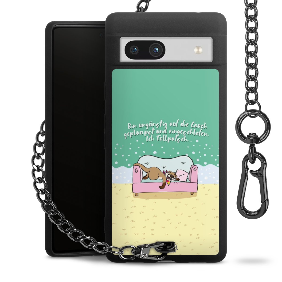 Die mattschwarze Silikon-Handyhülle besteht aus robustem TPU (thermoplastisches Polyurethan). Sie ist flexibel und schützt Dein Smartphone vor Stößen und Kratzern. Die Kette sowie der Karabinerhaken sind aus Metall in Gunmetal-Optik gefertigt. Für dieses Produkt kommen ausschließlich TÜV-geprüfte Materialien zum Einsatz.