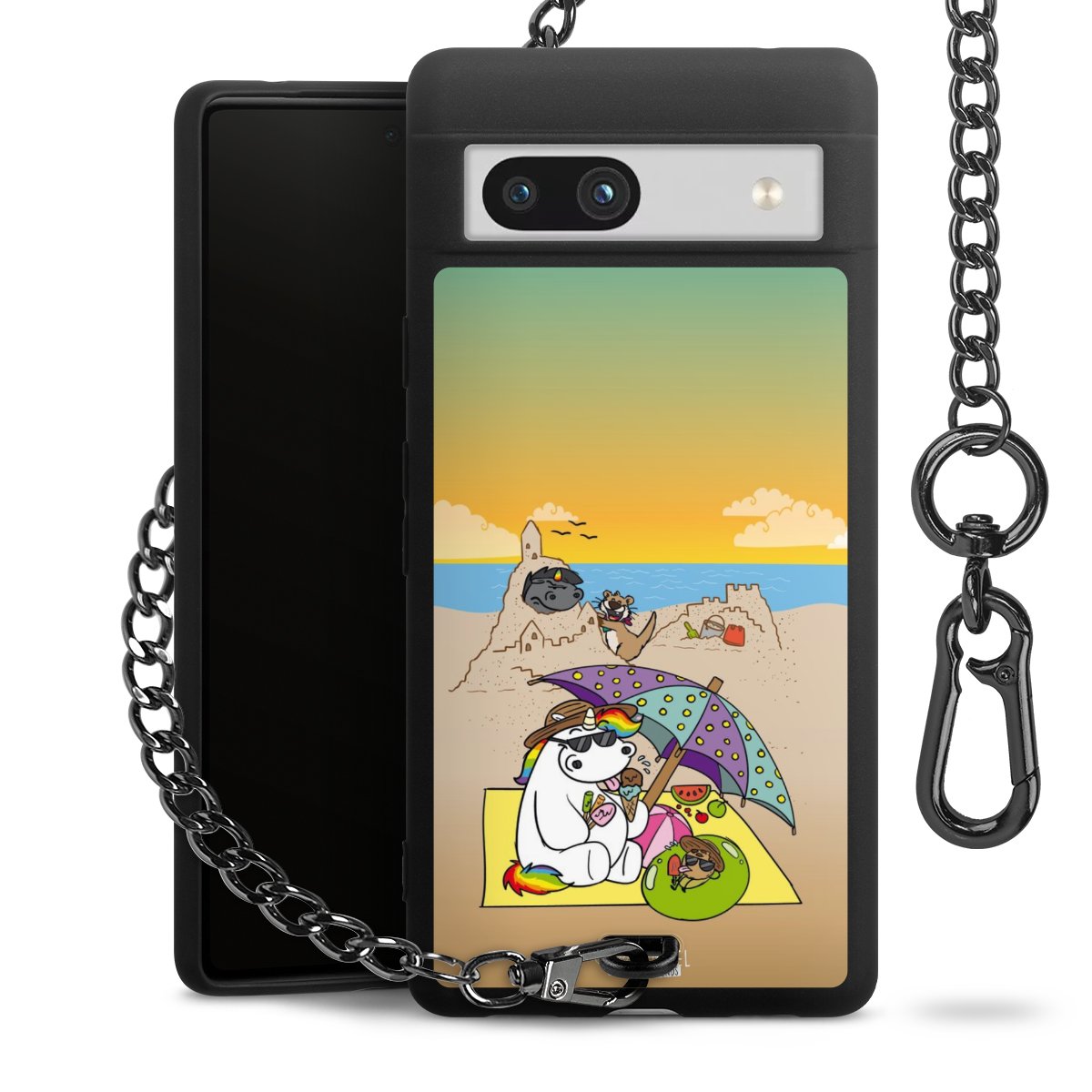Die mattschwarze Silikon-Handyhülle besteht aus robustem TPU (thermoplastisches Polyurethan). Sie ist flexibel und schützt Dein Smartphone vor Stößen und Kratzern. Die Kette sowie der Karabinerhaken sind aus Metall in Gunmetal-Optik gefertigt. Für dieses Produkt kommen ausschließlich TÜV-geprüfte Materialien zum Einsatz.