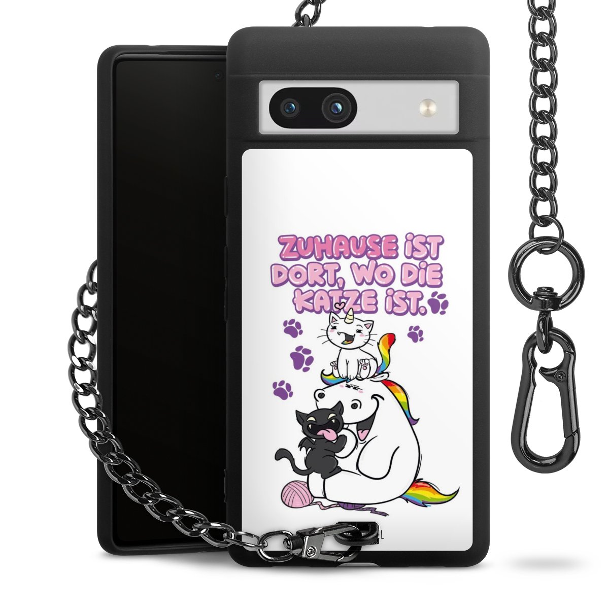 Die mattschwarze Silikon-Handyhülle besteht aus robustem TPU (thermoplastisches Polyurethan). Sie ist flexibel und schützt Dein Smartphone vor Stößen und Kratzern. Die Kette sowie der Karabinerhaken sind aus Metall in Gunmetal-Optik gefertigt. Für dieses Produkt kommen ausschließlich TÜV-geprüfte Materialien zum Einsatz.